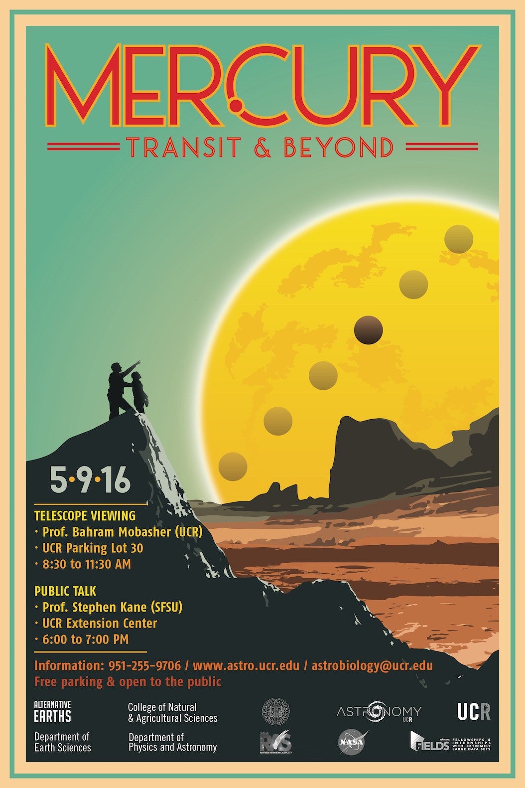 Stephen Kane will give a public talk on Monday, May 9 at the UCR Extension Center from 6 to 7 p.m. Kane researches planets around other stars and will discuss the relationship between Mercury and exoplanet transit. Professor Bahram Mobasher (UCR) will host a public telescope viewing of the transit on Monday, May 9 at UCR Parking Lot 30 from 8:30 to 11:30 a.m.