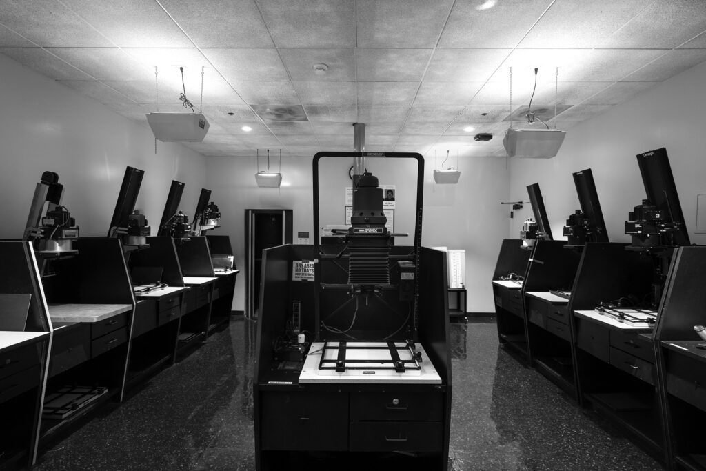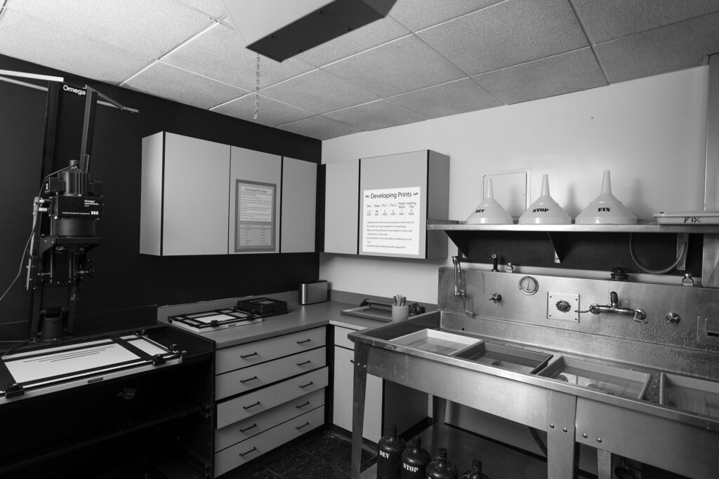 The Art Department has a considerable amount of Black & White photography resources including individual darkrooms, group darkrooms, film processing and several film scanners. Facilities are available during open lab hours to art majors and students currently registered in an art department class (prior experience may be required). Color film processing is optional if students can provide their own chemicals.