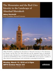 Abbey Stockstill is completing her dissertation at Harvard University on The Mountains, the Mosque, and the Red City: Abd al-Mu’min and the Almohad Legacy of Marrakesh. Her interests place Marrakesh as a meeting point of the Mediterranean (both North Africa and Iberia) and Sub-Saharan Africa in the period 1000-1500, and incorporate a number of other interests, from performance and ceremonial to technological transmission.