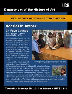 Faya Causey’s lecture title, Not Set in Amber, might suggest something about the subjects she will speak about on January 19, 2017. Her most important publications have been centered on ancient art, a few contemporary artists, Paul Cézanne, and the fossil resin, amber — its nature, importance to humans over history as a high-value substance used for ornament, as amulet, as medicine and for incense especially in the ancient world. Although her first jobs as a professor seemed to indicate a life in academe, Causey took a different path in 1994 when she left a tenured position as an art history professor to work at the National Gallery of Art in the Education Division as the Head of the Academic Programs Department. Her career was not fossilized! In addition to an overview of her fascinating work at the ArtCenter Pasadena, California State University Long Beach, at the National Gallery of Art, Causey will speak about alternative career paths for students interested in art, art history, archaeology, and the humanities.