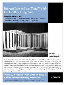 Lea Lublin resided for the most part in Paris from 1964 on, and by 1965 she started orienting her work toward establishing a methodology for reading images, based on different parameters of perception and participation related to the devices involved in their exhibition. Until 1972 she articulated a considerable portion of her projects between Paris, Buenos Aires and Santiago de Chile. These networks of production and circulation were decisive in constructing the meaning of her works in terms of exploring the status of representation and culture. We propose a study that would restore the geopolitical density and translocal nature of her production of the long sixties.