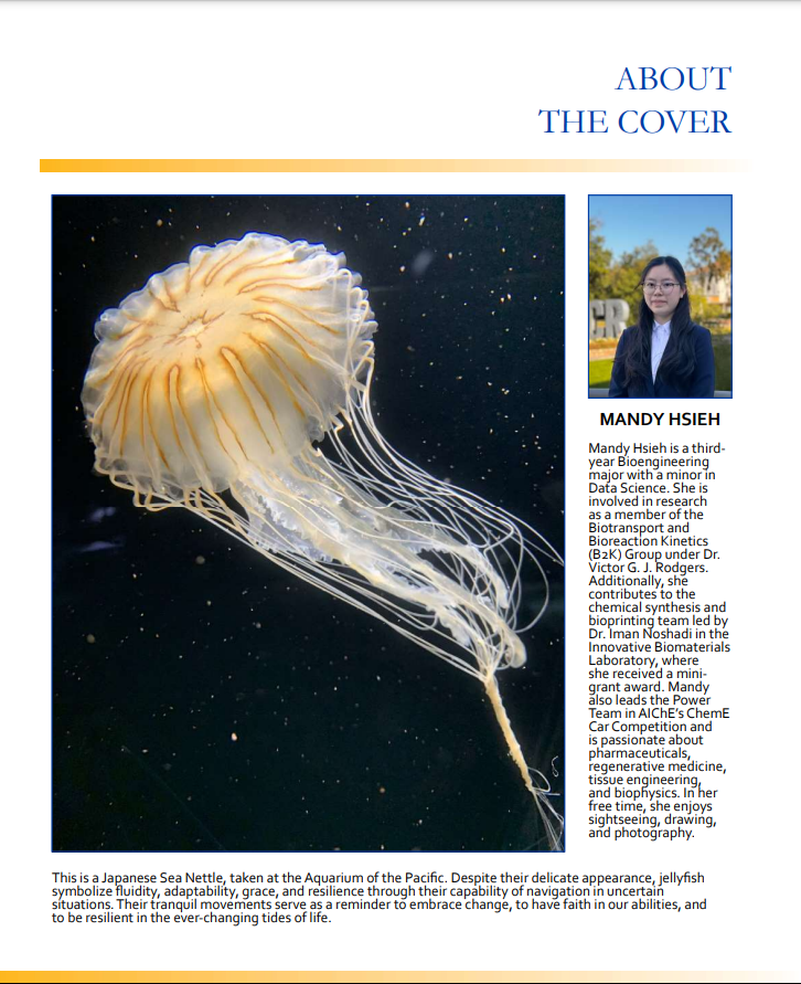 Mandy Hsieh's photograph of a Japanese Sea Nettle takes the cover of the 2024 UCR Undergraduate Research Journal. Mandy also published her work on addressing the significance of crowding on the equilibrium protein kinetics. Her research, in collaboration with Professor Jiayu Liao and his students, Chuchu Liu and Gagan Mannur, looked at the potential differences in the dissociation equilibrium constant from FRET analysis of CyPet-SUMO1 and YPet-Ubc9 in the presence of high concentrations of bovine serum albumin. The results showed crowding can increase the dissociation constant by a factor of three. Her exciting preliminary work opens the door for more extensive research to better understand this phenomenon.