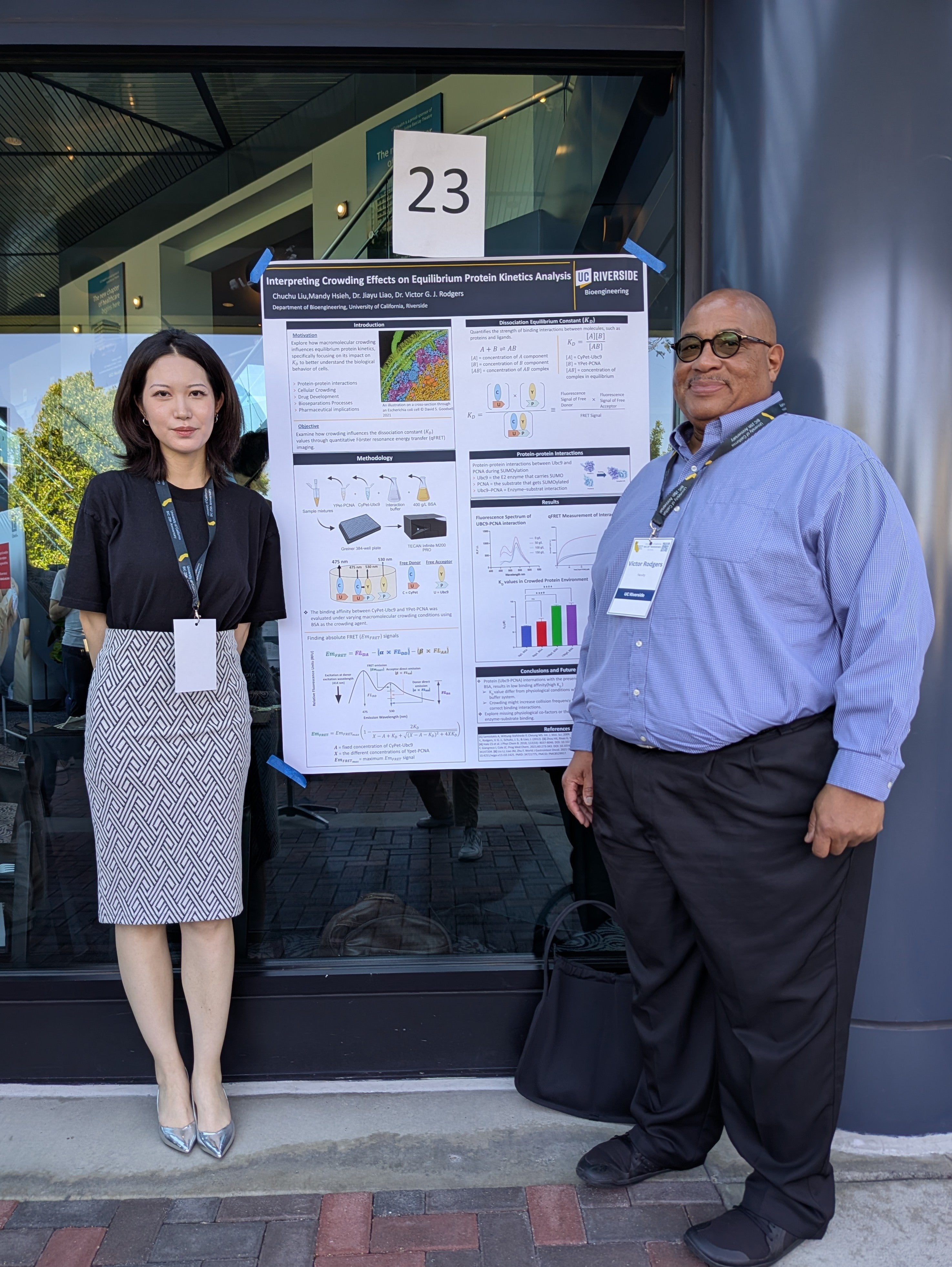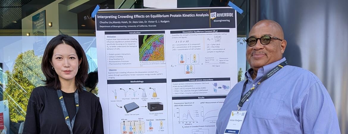 Chuchu Liu, an MS student in Professor Jiayu Liao's group presented our collaborative work at the UC Systemwide Bioengineering Symposium in June, 2025. Chuchu worked with Mandy Hsieh on quantifying the changes in the dissociation constant for SUMO-proteins using FRET under crowded conditions. An earlier version was published in the UCR Undergraduate Journal and Chuchu and Mandy are now preparing a manuscript for an international journal.