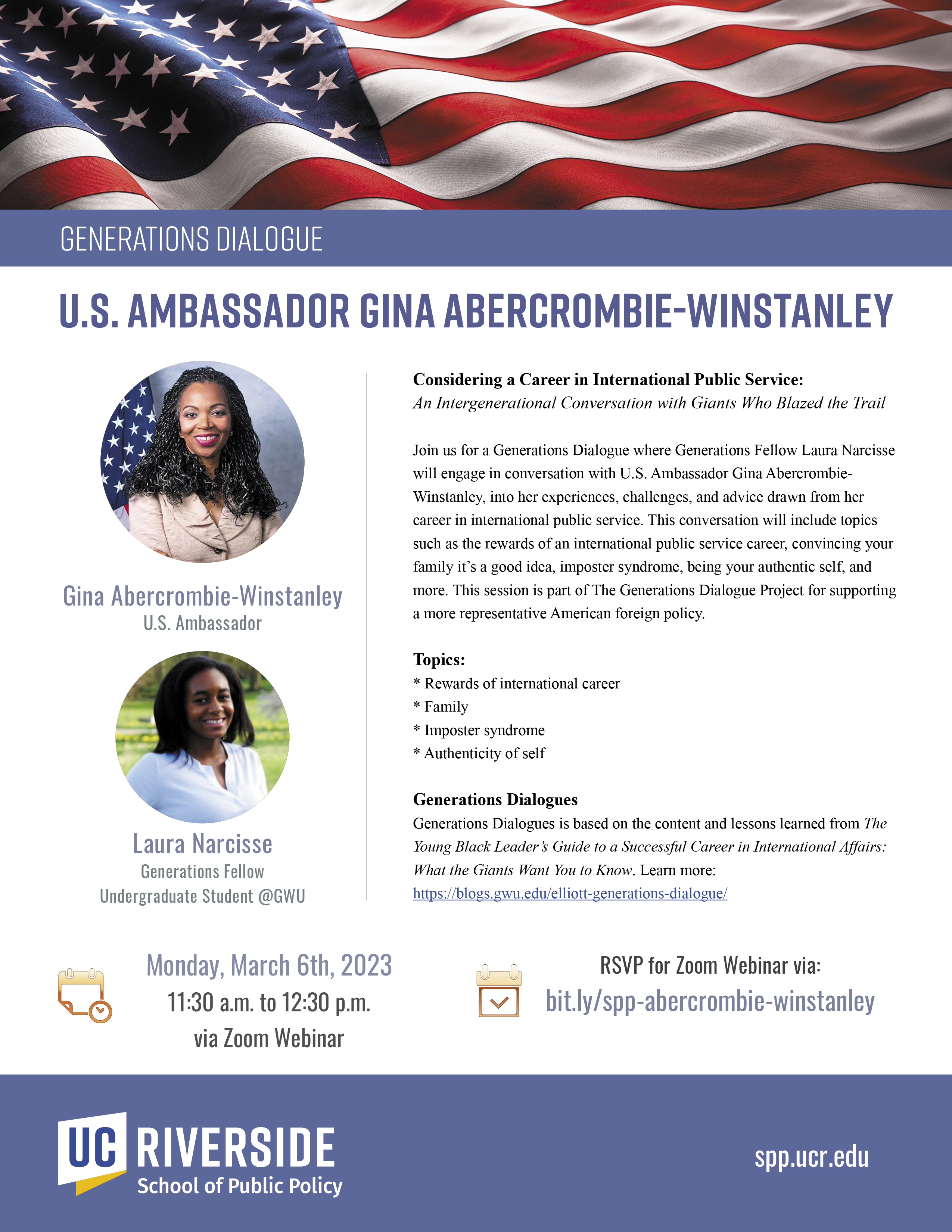 On Monday, March 6th, the UCR School of Public will host a virtual seminar featuring U.S. Ambassador Gina Abercrombie-Winstanley and Generations Dialogue Fellow Laura Narcisse. The event, titled “Considering a Career in International Public Service: An Intergenerational Conversation with Giants Who Blazed the Trail,” is part of the Generations Dialogue project, an initiative to increase representation in American Foreign Policy.