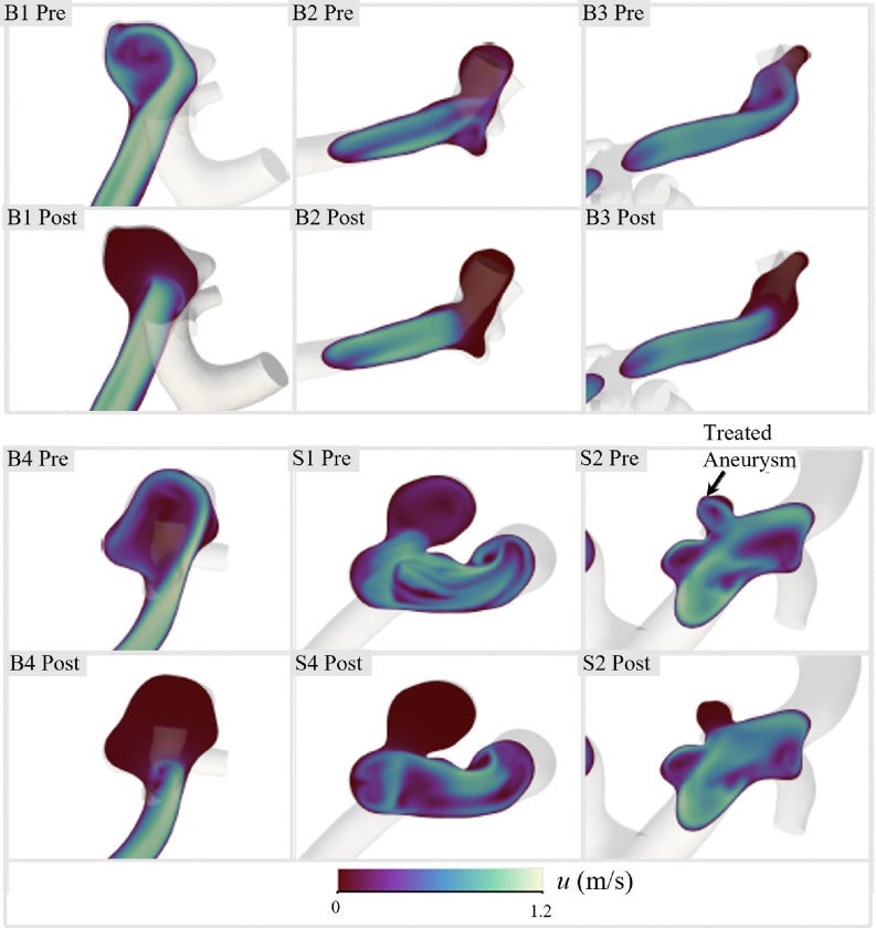 The study used computational fluid dynamics to evaluate the hemodynamic and heat transfer effects of shape-memory polymer foam (SMPf) devices in six patient-specific aneurysm geometries. The SMPf device, modeled as a porous medium, significantly reduces intra-aneurysmal blood flow and demonstrates effective thermal behavior under worst-case conditions. The findings offered a validated, practical framework for optimizing personalized SMPf-based embolization therapies for improved treatment of intracranial aneurysms.