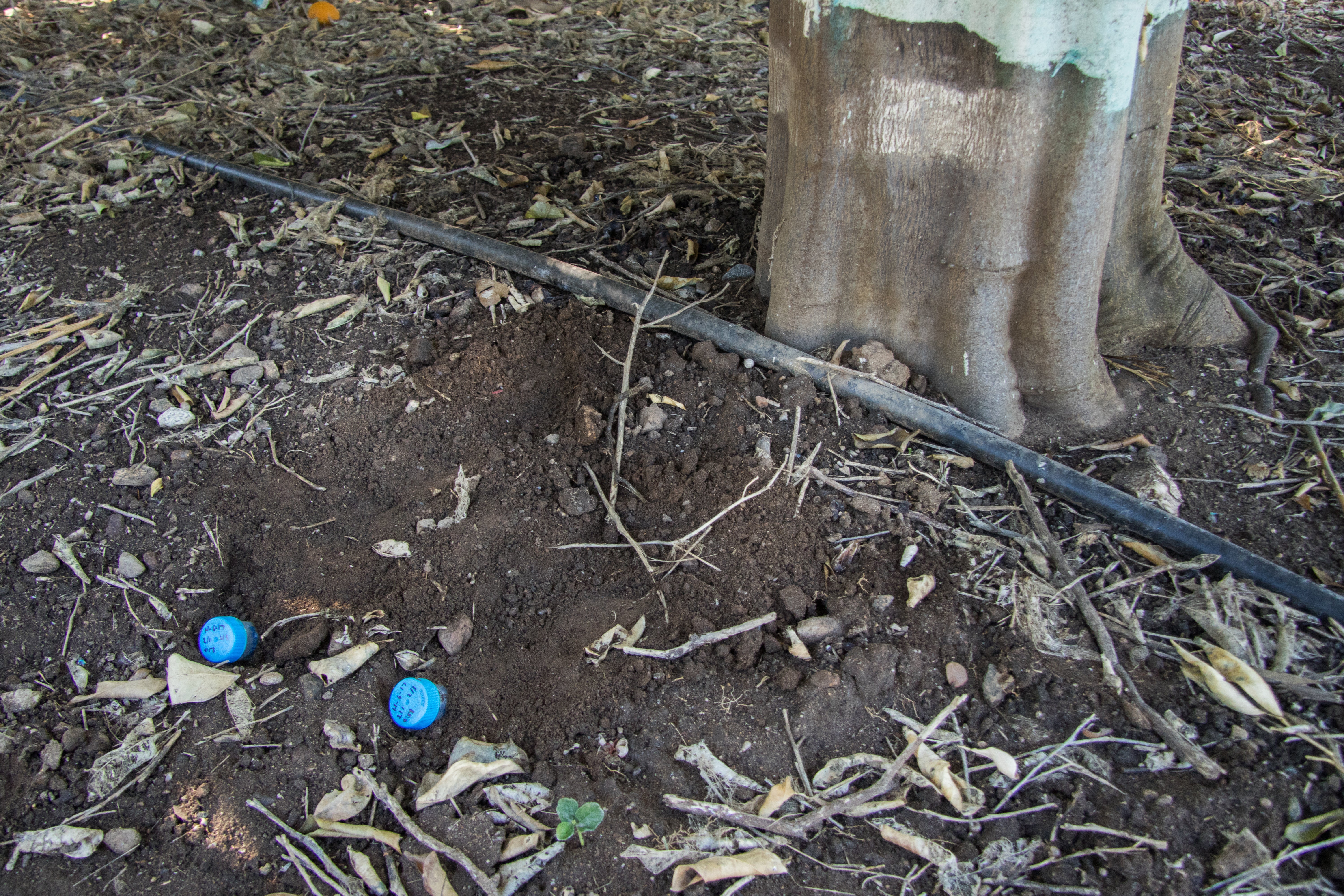 One way to reduce irrigation line use by Argentine ant is to simply cover the pipes by burying it under the soil or covering it with high quality composted organic mulch (Fig. 22). Ants cannot use the covered irrigation pipes and are forced to move over uneven terrain. This may slow their transit times, which could possibly reduce ant numbers in the canopy, thereby giving natural enemies more time to attack and kill hemipteran pests before ants interfere with them. Mulch has many benefits when applied in orchards. These benefits include improved water retention in soil, enhanced soil quality, weed control, stabilization of soil temperatures, and increased diversity of soil inhabiting natural enemies.