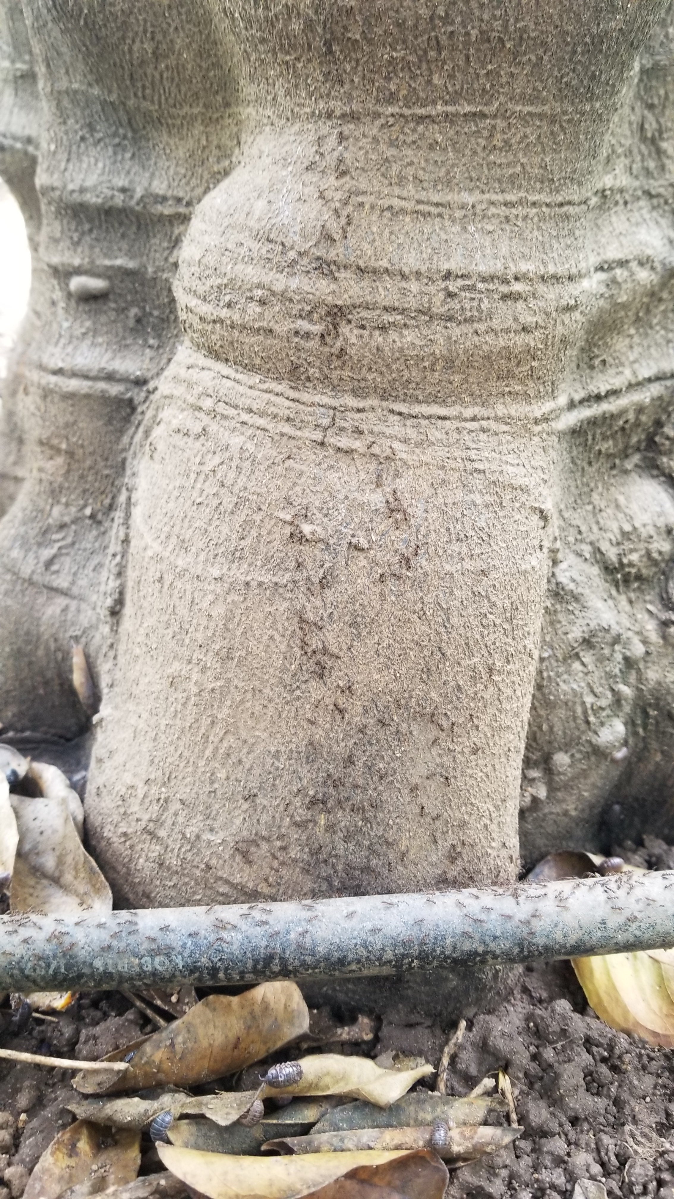Sticky Barriers: A second cultural control practice, application of sticky barriers to trunks, restricts ant movement into the canopy because ants can’t easily cross this barrier. This cultural control technique is often temporary as dust, leaves, and twigs that get stuck on the barrier form bridges over which ants can travel. Dead ants trapped in sticky material may also contribute to bridge building, eventually allowing nest mates to cross the sticky barrier to reach honeydew producing pests. Sticky barriers are expensive to apply in terms of materials and labor, and may potentially, cause trunk damage.