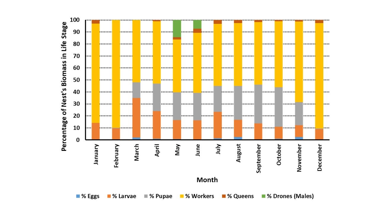 Argentine ants have a haplodiploid sex determination system. In haplodiploid systems, unfertilized eggs develop into haploid males (i.e., drones), while fertilized eggs develop into diploid females. In the case of Argentine ants, fertilized eggs that develop into females can potentially become queens or workers, depending on environmental factors such as nutrition and pheromone cues. Worker ants are typically sterile and do not reproduce, while the queens are responsible for laying eggs and propagating the colony. Inside nests, eggs, larvae, pupae, workers, and queens (Fig. 8) are found year round, but their relative abundance, measured as percentage biomass (i.e., the aggregate weight of individual life stages extracted from nests), varies over time (Markin 1970) (Fig. 9). Male ants are most abundant in nests over May-June (Markin 1970) (Fig. 9). Densities of workers foraging outside of nests tend to be most abundant in citrus orchards over June-November with ~80% of workers being observed over this time period (McCalla et al. 2023) (Fig. 10).