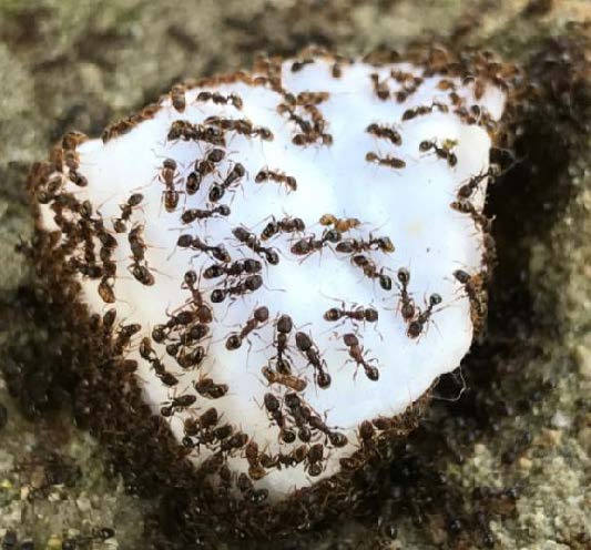 Insecticide Management of Argentine Ant: Broad spectrum contact sprays can be applied to trunks and soil under trees. Direct contact with wet material or dried residues kill foraging workers. This approach provides quick but temporary knockdown of ants as only above surface foraging workers are killed. Ant brood, drones, and queens are protected from sprays as they inhabit subterranean nests. The inability of contact sprays to kill queens and brood permits colonies to rebuild and rebounding populations overwhelm treatment effects as residue efficacy diminishes over time. An unwanted side effect of broad spectrum contact spray applications is the unintentional killing of beneficial insects, especially natural enemies, which ironically, are anticipated to flourish when ant presence with honeydew producing pest colonies is reduced due to spraying. An alternative approach to delivering insecticides is to deliver toxins directly to ants in a highly targeted way using liquid bait, a 25% sucrose solution infused with insecticides. This approach protects natural enemies from non-target impacts that result from broad-spectrum insecticide applications.