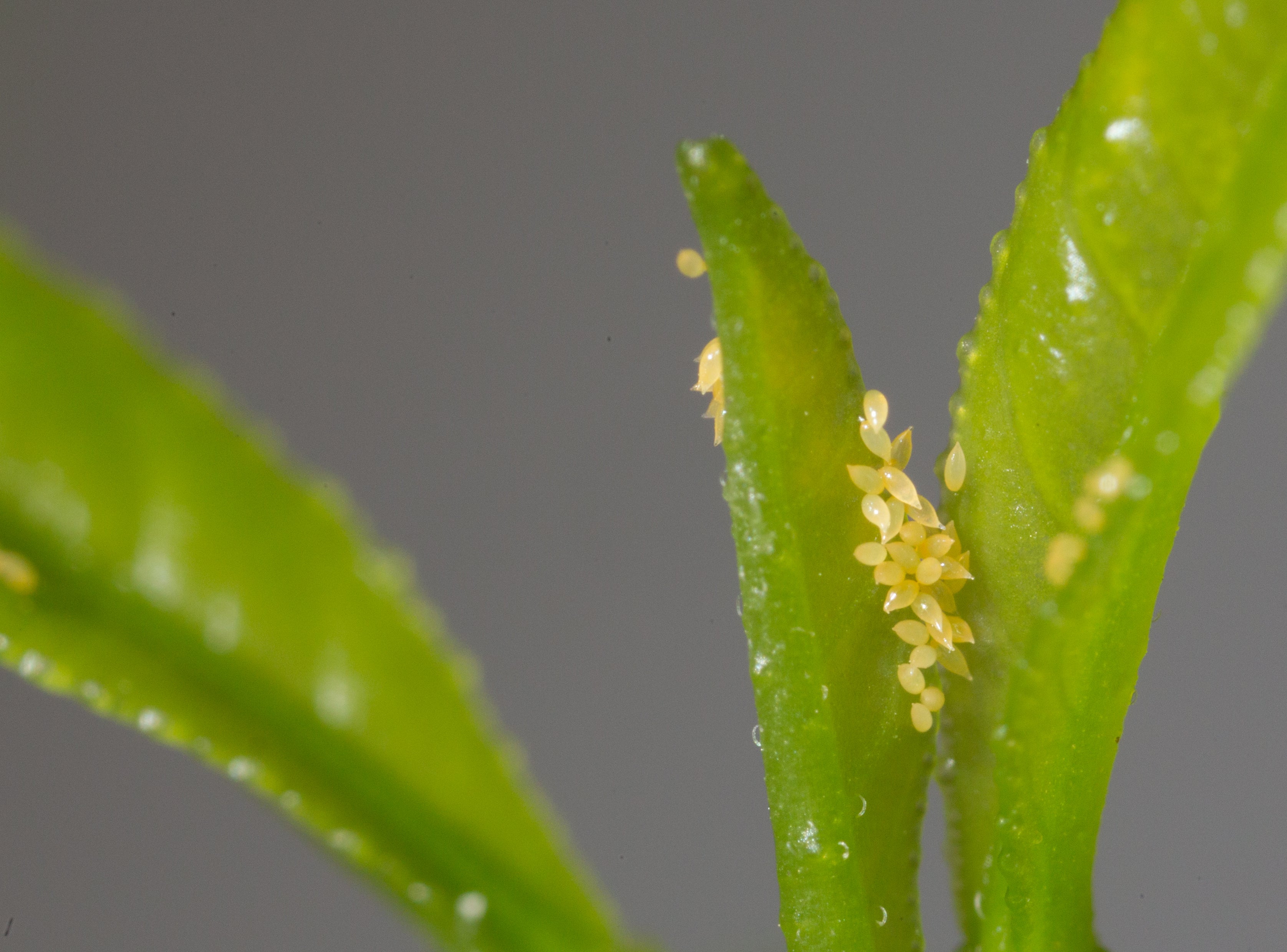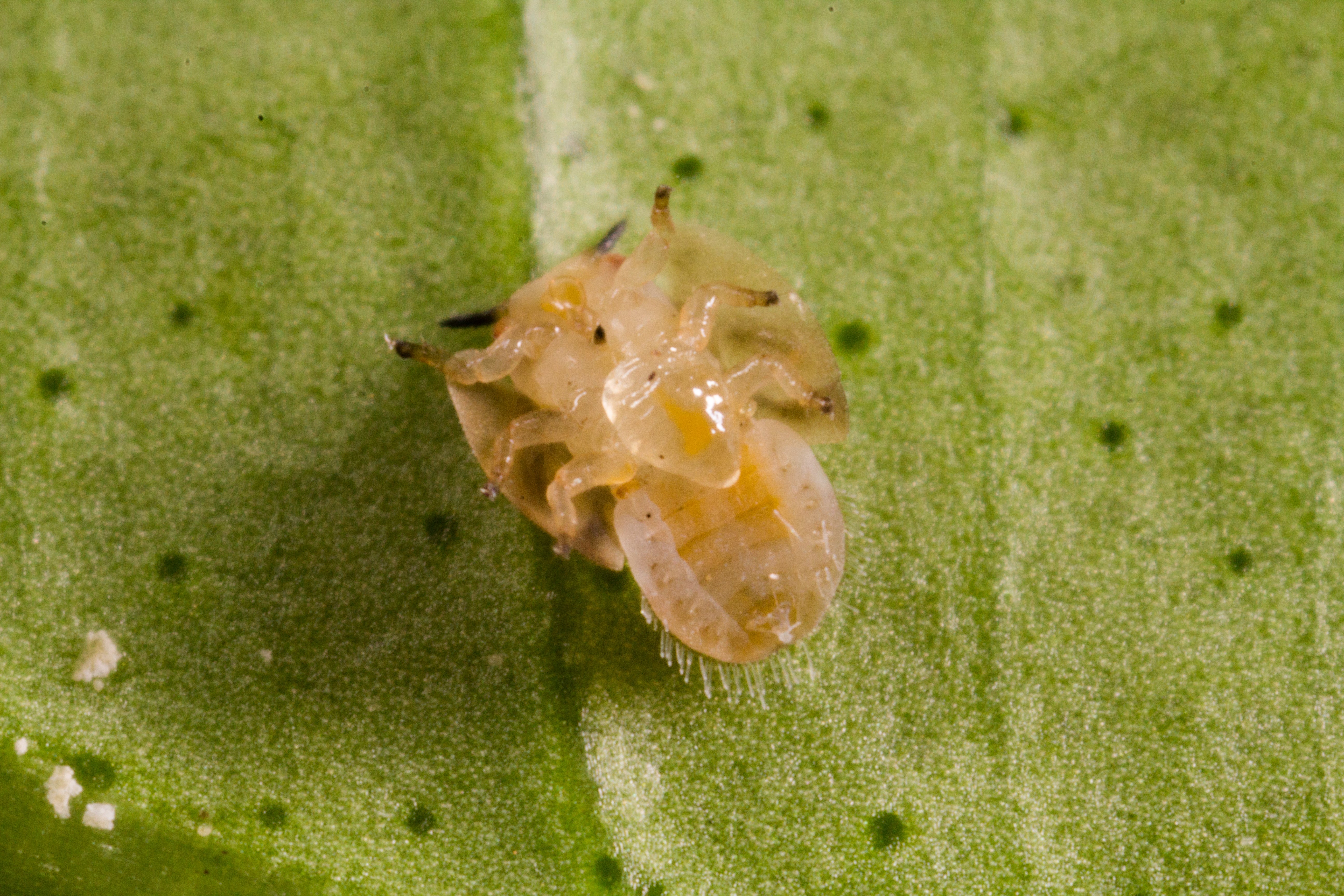 Eggs. ACP eggs are 0.3 mm long, elongated with a tapered tip, and they are attached to the surface of the host plant with a short stalk or pedicel, which is approximately 0.04 mm long. The long axis of the egg is vertical to plant surface which gives the egg the appearance of standing on its end (Hall et al. 2013) (Fig. 3a,b). Freshly deposited eggs are pale, but gradually turn bright yellow and later orange before hatching. Eggs are laid only on young plant tissue, most abundantly on the unfolding apical ‘feather flush’ leaves (Fig. 4[I4] ) (Halbert & Manjunath 2004). Fertilized eggs typically take from 2-4 days to hatch, and unfertilized eggs do not hatch (Tsai & Liu 2000; Hall et al. 2013).