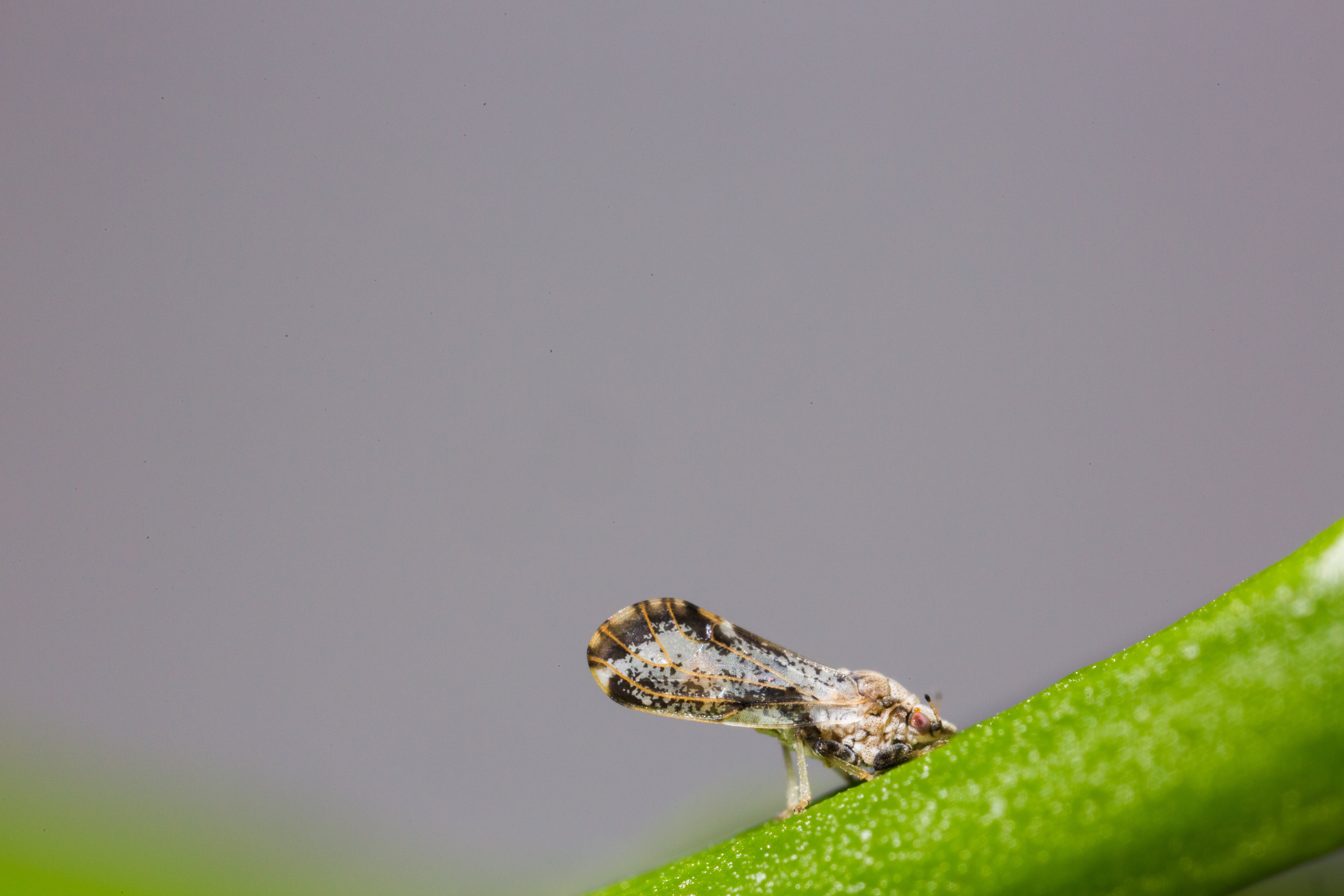 Adults. Adult ACP are small, ~ 4 mm long, with a mottled gray body covered with white waxy secretions and pale brown antennae with black tips (Figs. 1 & 3f) (Hall et al. 2013). After the last nymphal molt, adults are at first pale brown-gray, but soon darken (Grafton-Cardwell et al. 2013). The distinctively patterned forewings of D. citri are broadest at the back (Figs. 1 & 3f). Adult D. citrifeed on phloem plant tissue, primarily on the underside of citrus leaves or new growth. When feeding, adult ACP hold their bodies in a characteristic head down-tail up posture, which is achieved by resting on the “elbows” of bent front legs which creates ~45o angle with the plant (Figs. 1 & 3f) (Hall et al. 2013). In the field, adult ACP can be found on citrus via visual inspection of new flush, tap sampling or by captures on yellow sticky cards (Fig. 5[I5] ).