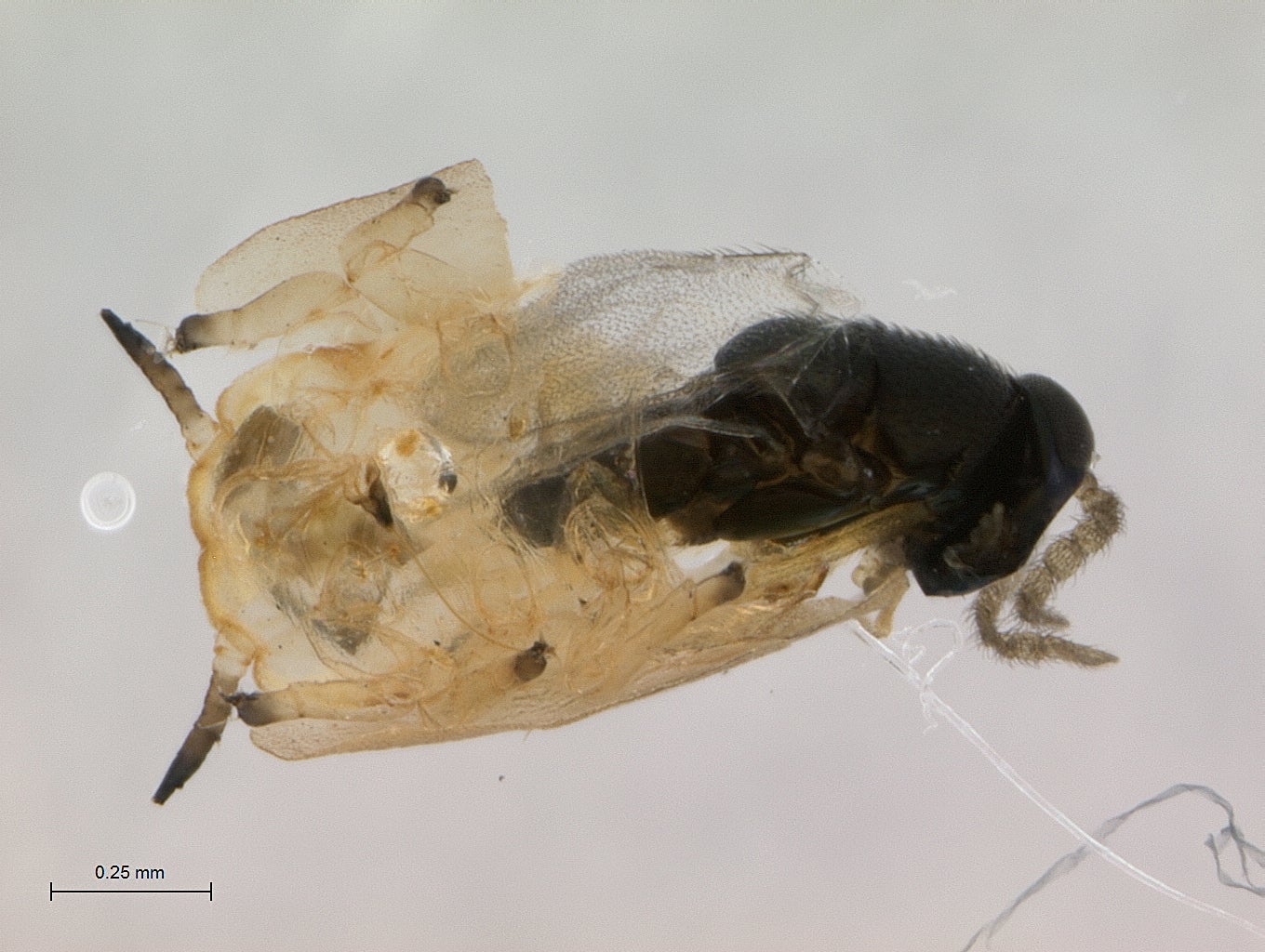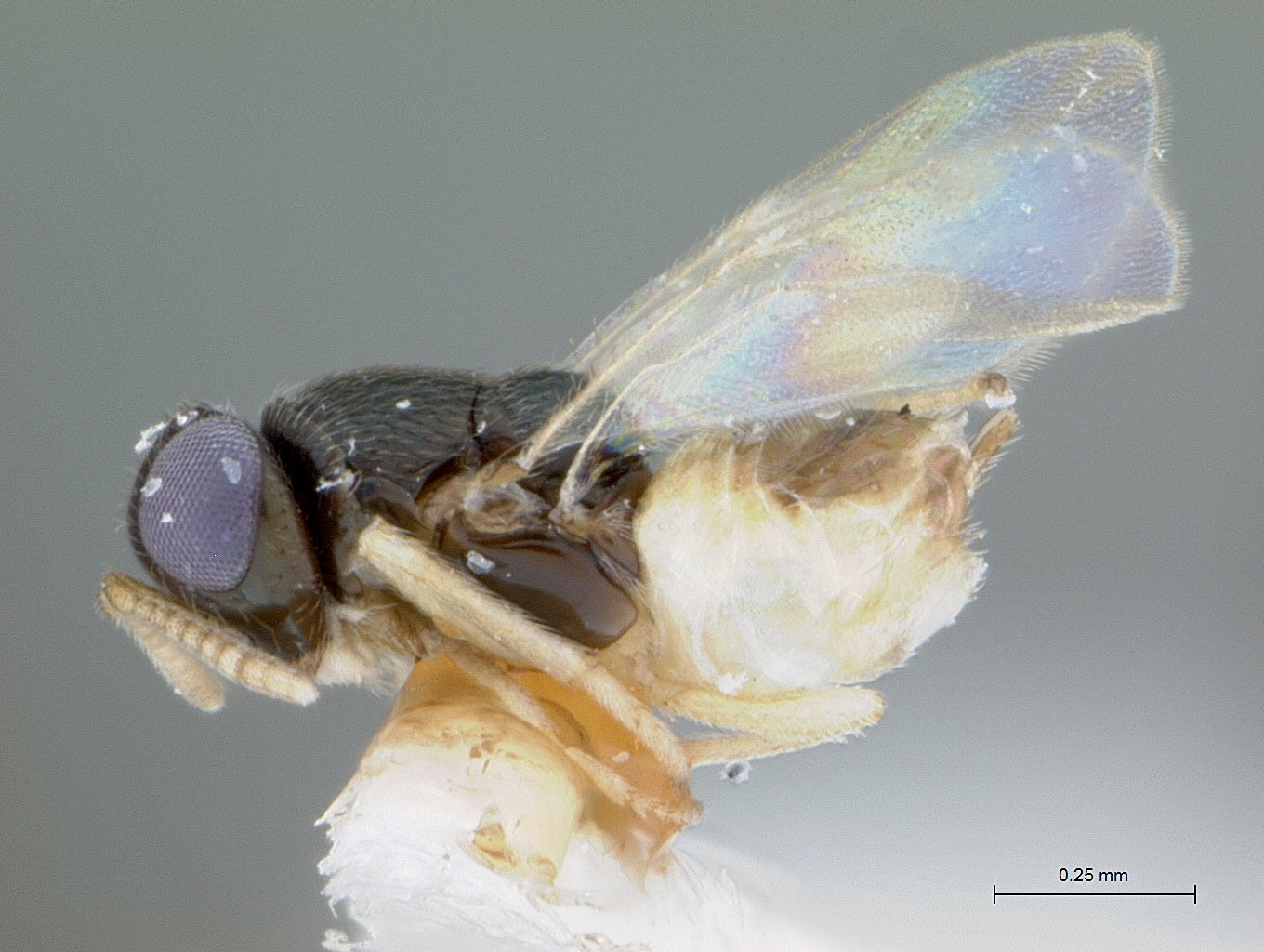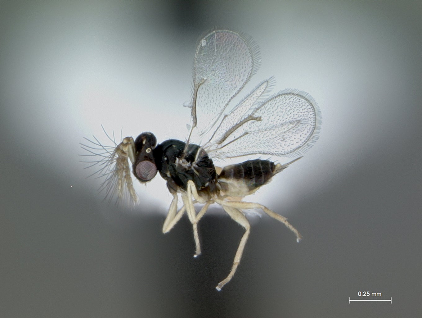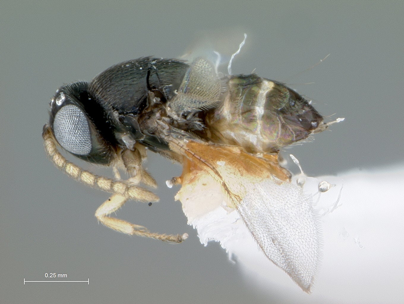 Tamarixia radiata.(Waterston) (Hymenoptera: Eulophidae) (Fig. 7[I7] &8). Tamarixia radiata is a host-specific, idiobiont ectoparasitoid of ACP nymphs, originally described from specimens that emerged from parasitized ACP nymphs on lemon leaves collected from Lyallpur Pakistan (today this city is known as Faisalabad) (Waterston 1922). T. radiata are small (~1mm long), with a black and yellow body, yellow legs, transparent yellow-veined wings, and two red eyes (Table 1; Fig. 7) (Chen & Stansly 2014). Sexual dimorphism is evident between adult males and females. Males are typically darker and smaller than females, and have long hairy antennae comprised of 9 segments; female antennae are eight-segmented and lack hairs (Fig. 7).