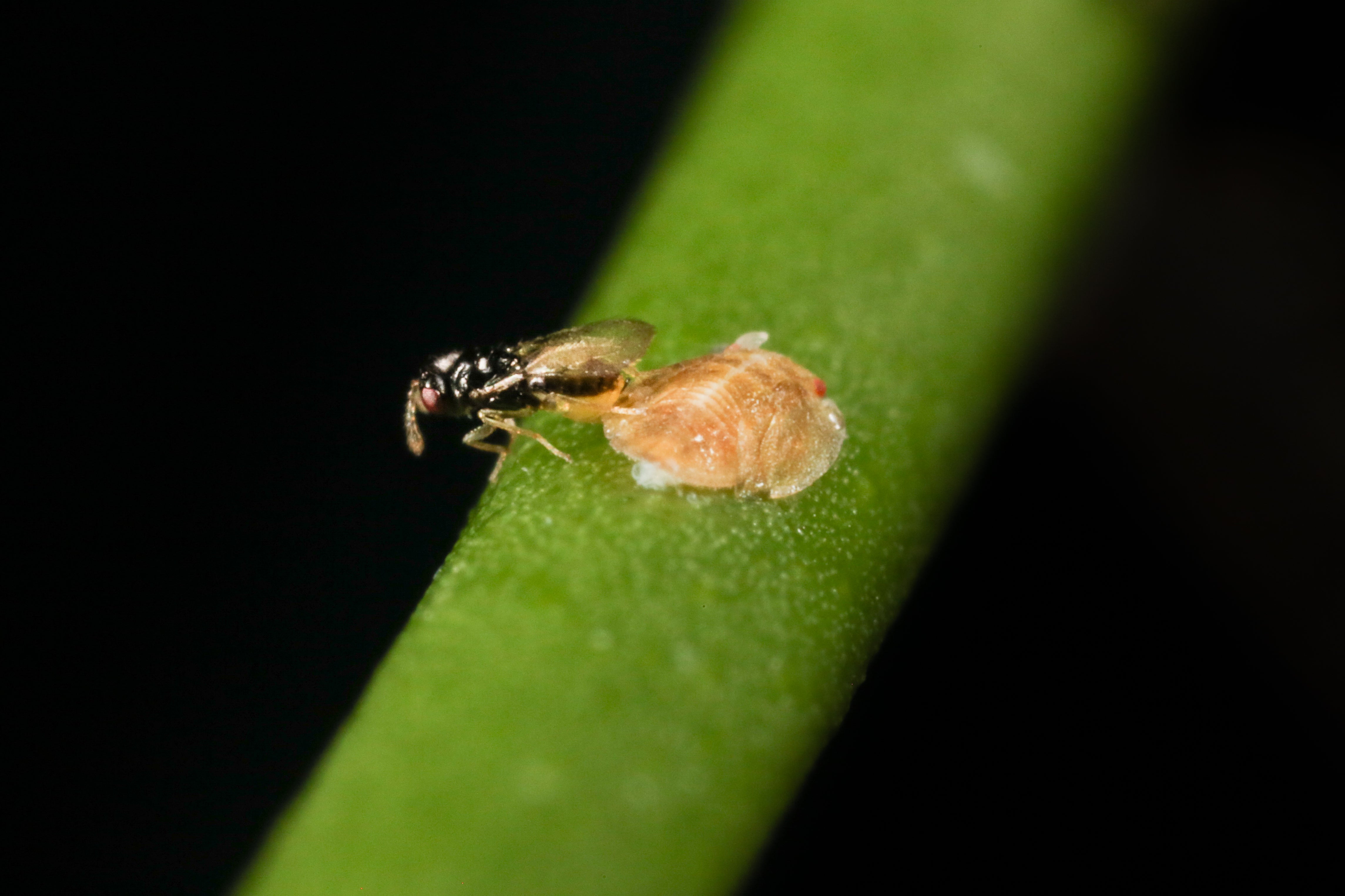 Both fertilized (result in female offspring) and unfertilized (result male offspring) eggs may be laid immediately following emergence. However, host feeding enables females to produce more eggs over the course of a lifetime, a phenomenon known as synovigeny(Chien et al. 1994; Jervis et al. 2001; Chen & Stansly 2014). Laboratory studies indicate that female T. radiata do not oviposit on previously host-fed nymphs and can discriminate between parasitized and unparasitized hosts thereby avoiding superparasitism(Chen et al. 2016). Overall host-killing capacity (i.e., a function of longevity and fecundity) depends on a variety of factors (see Vankosky & Hoddle 2016) especially temperature, which is optimal at a constant 25oC (77oF) in the laboratory (Chu & Chien 1991; Chien et al. 1995; McFarland & Hoy 2001).