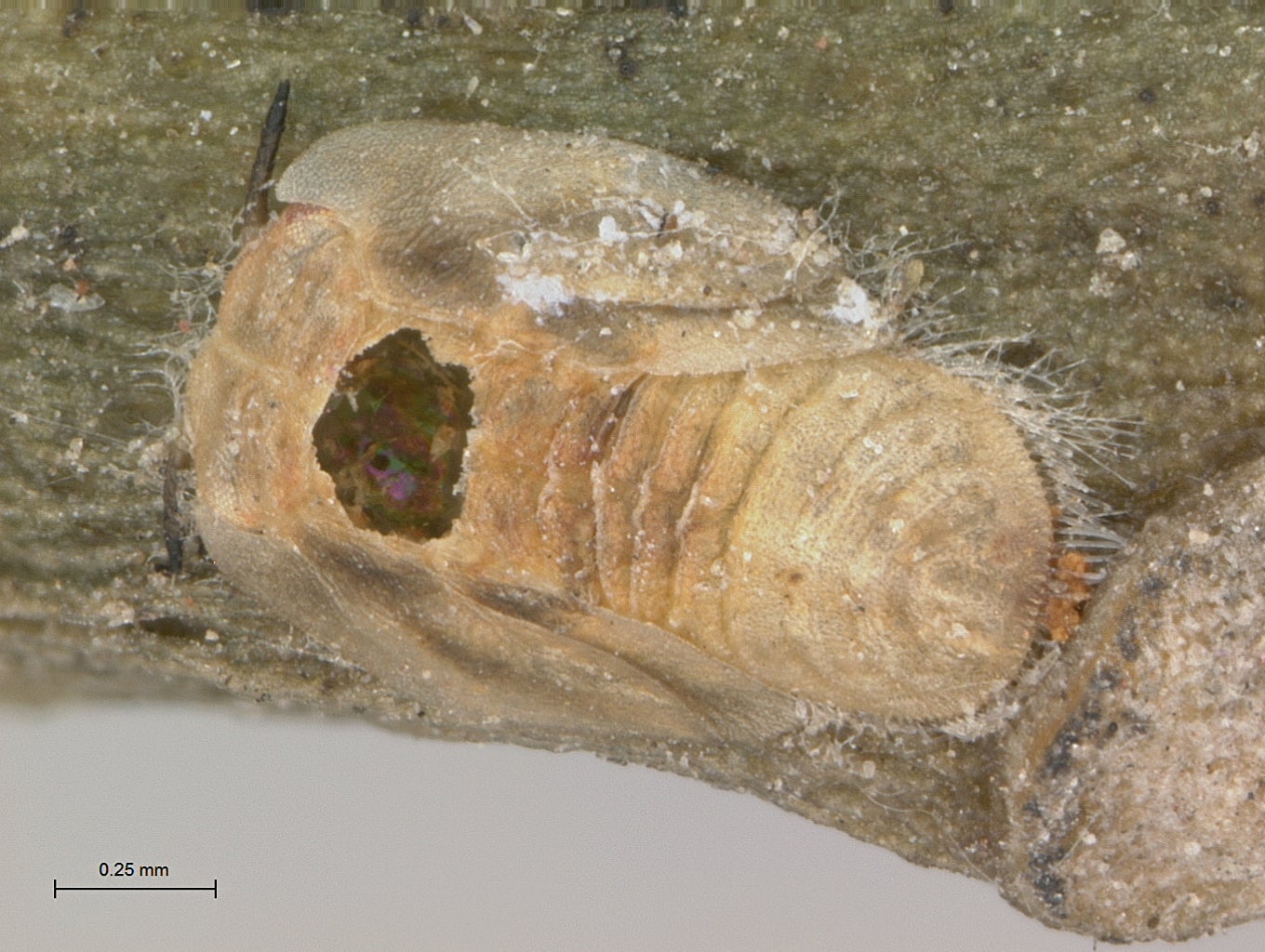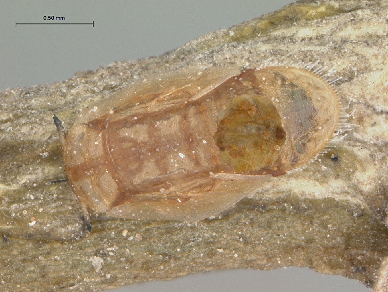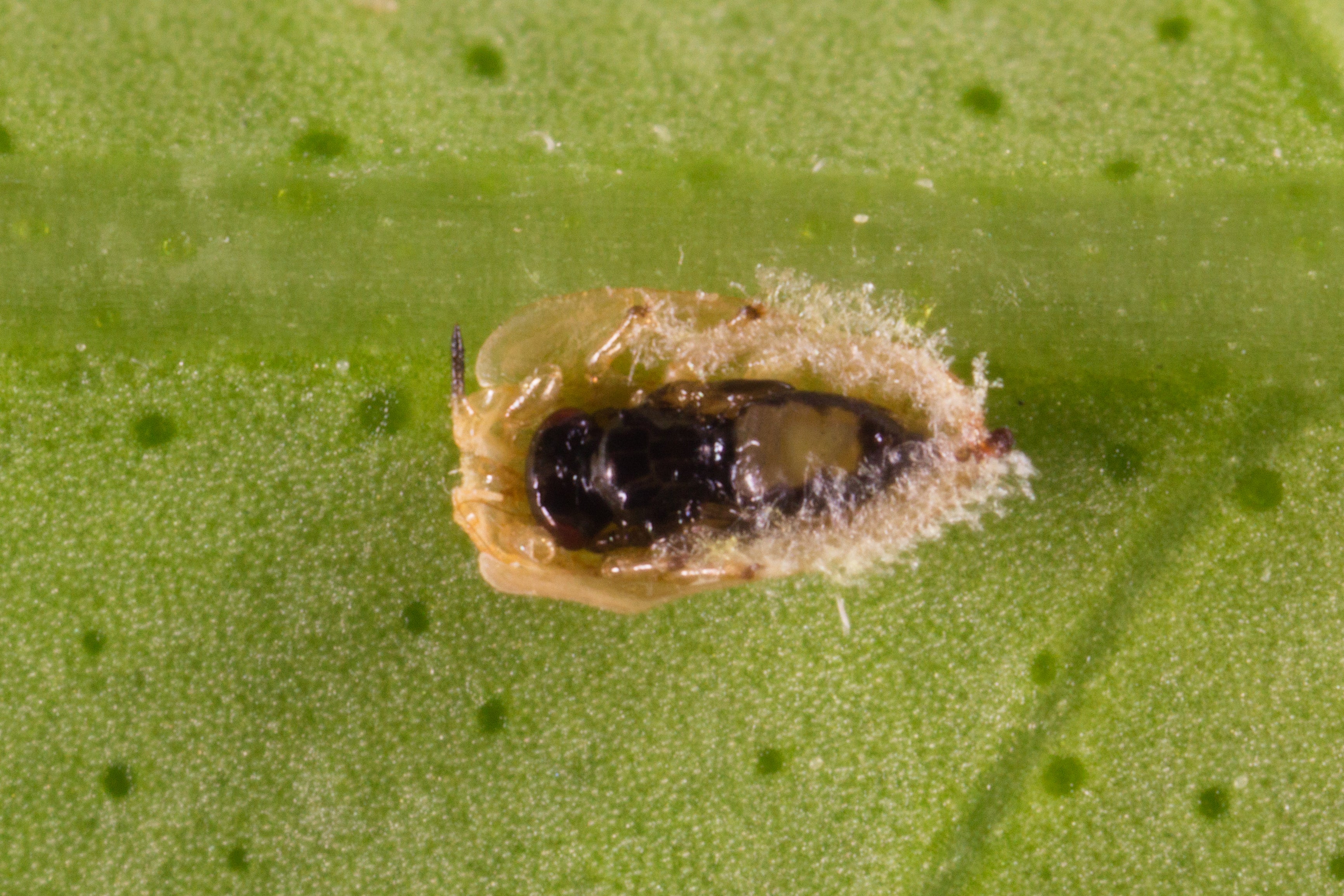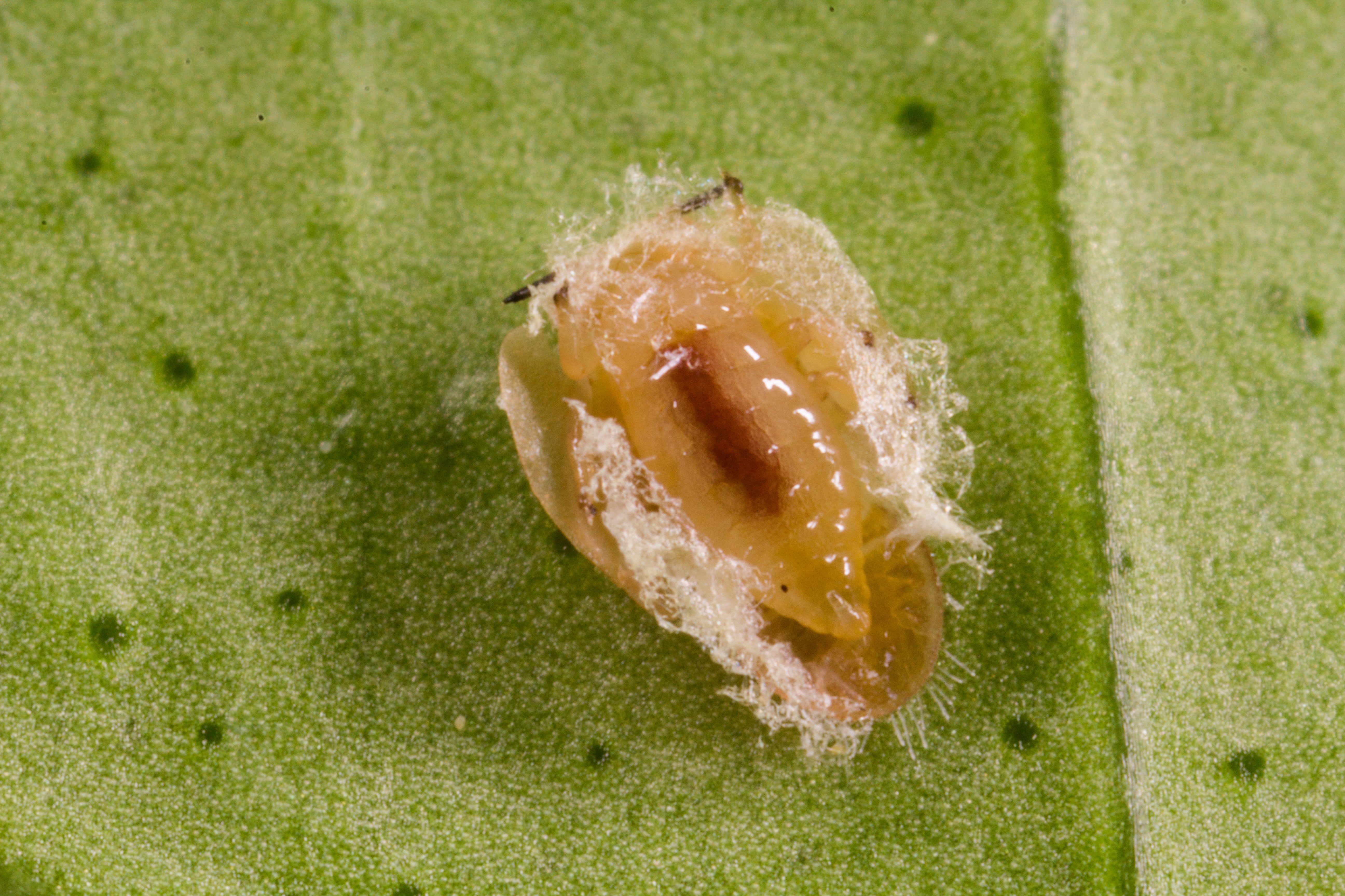 T. radiata females typically lay a single egg near the mid or hind coxa (the leg segment that attaches to the body of the nymph) of a fourth or fifth instar ACP nymph. The egg is attached to the ventral or bottom surface of the ACP nymph (Fig. 8a[I8] ,b) (Vankosky & Hoddle 2016). Here, the parasitoid larva hatches, feeds on the ACP nymph, and develops through four larval instars (Table 1; Fig. 8c,d) over ~11 days at 25oC, and 100% RH (Husain & Nath 1927; Chien et al. 1991; Chen & Stansly 2014). As T. radiata pupate, the appearance of their hollowed out dead hosts ‘mummify’. ACP mummies develop a brown, crusty exterior, beige silken threads that radiate from the margins of the host serve to anchor the ACP shell to the plant, and a dark meconium appears in the posterior end of the host (Fig. 8c-e). The hollowed out host protects the parasitoid pupa. Adult T. radiata upon emerging from the pupa chew a 0.5 mm diameter hole in the anterior thoracic region of the ACP mummy before crawling out (Table 1; Fig. 8e) (Aubert 1987; Chien et al. 1991; Chen & Stansly 2014). In laboratory trials, T. radiata is an efficient parasitoid, inflicting mortality of >90% of presented nymphs (Skelley & Hoy 2004). Chien et al. (1995) estimated that a single female can kill up to 500 nymphs in her lifetime. This is achieved through a combination of parasitism (which accounts for ~80% of ACP mortality), and host feeding (which accounts for about 20% of mortality). Host feeding is the process through which the female uses her ovipositor (an egg laying tube) to mutilate an ACP nymph. Hemolymph leaks from these wounds and female parasitoids consume this fluid which is an important protein source for developing and maturing eggs. The trauma of being “stabbed” and then feed upon is sufficient to kill ACP nymphs.