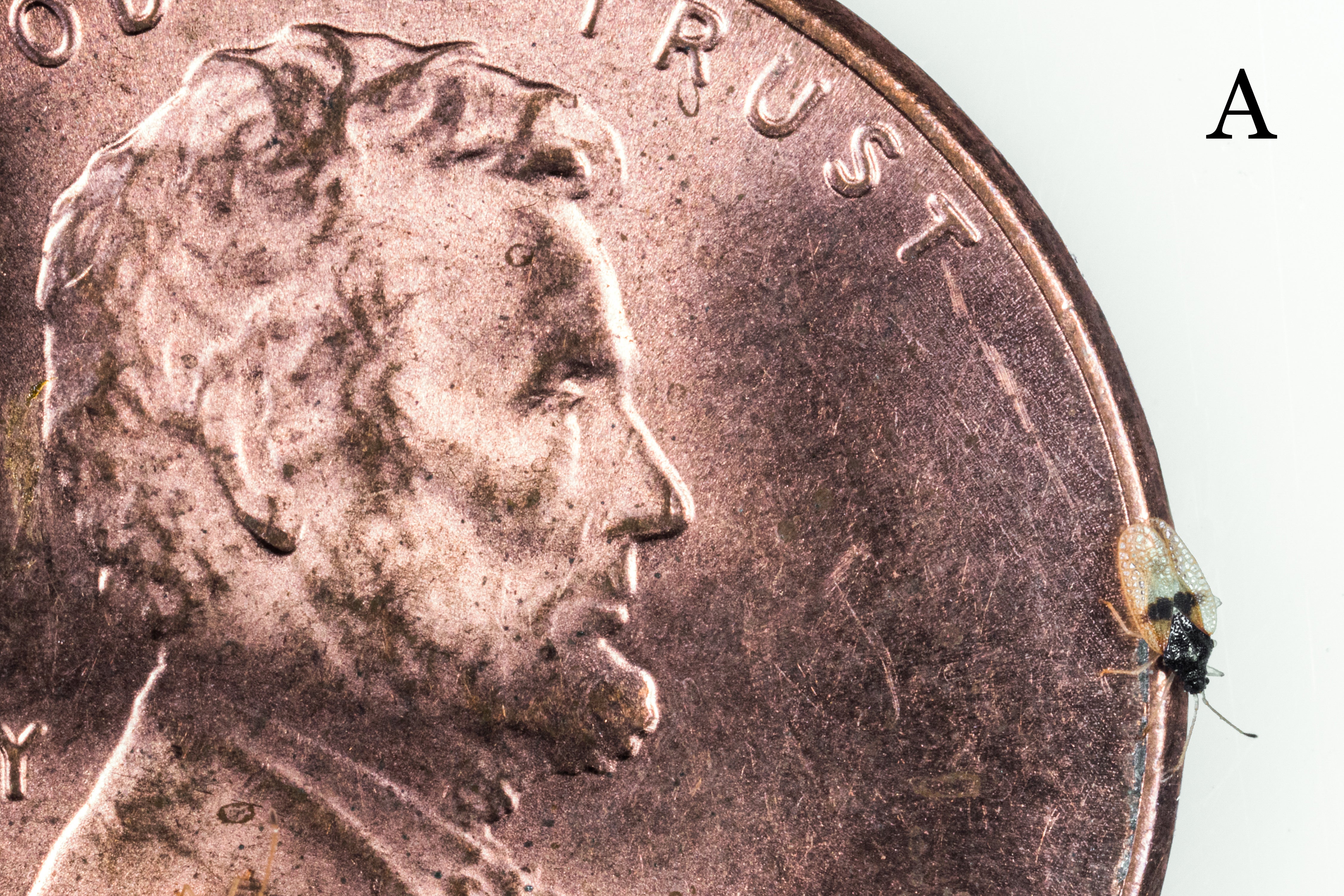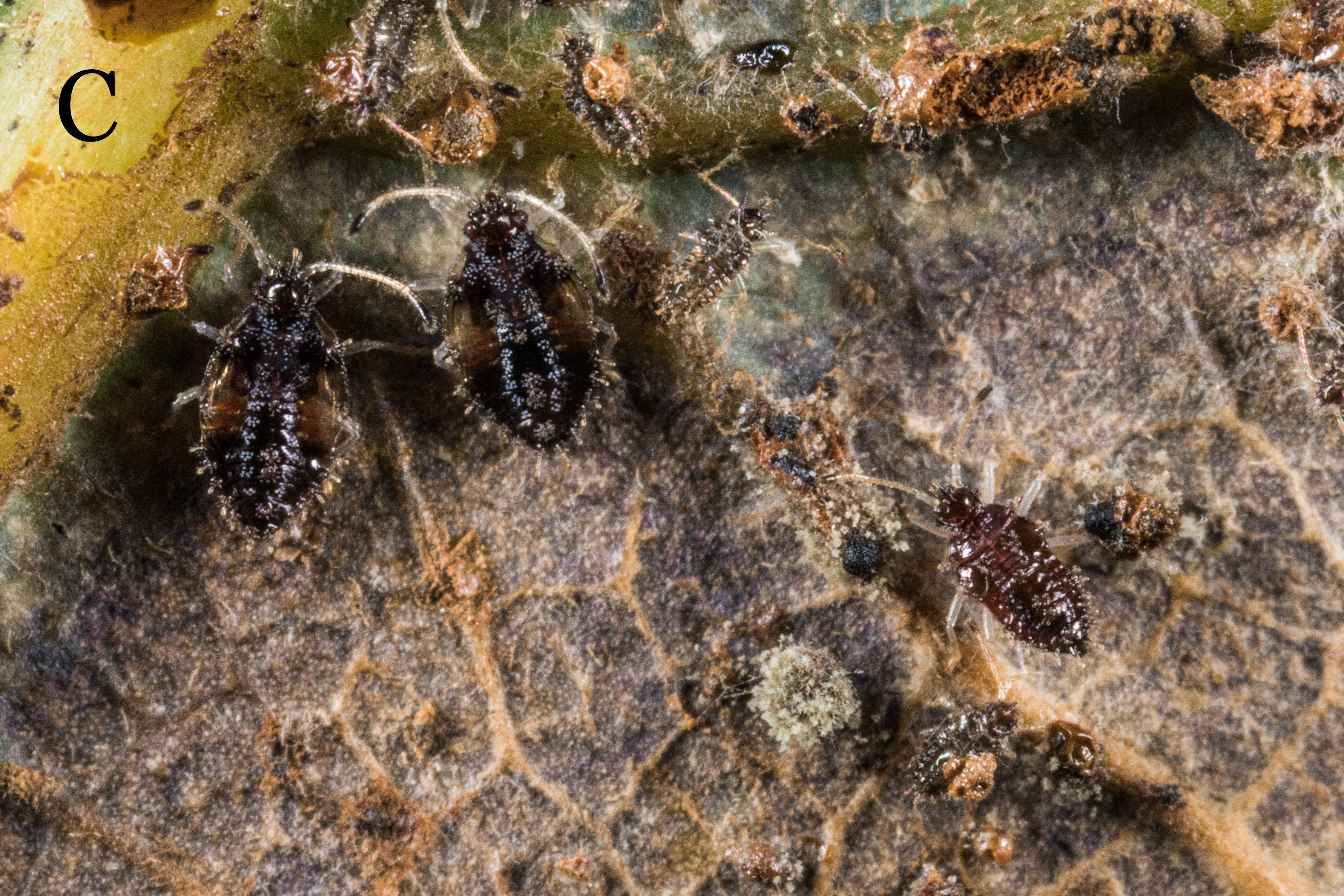 Adult avocado lace bugs are small winged insects about 2 mm in length (slightly longer than 1/16 inch [Fig. 1A]) with black bodies, yellow legs and antennae, and are visible to the naked eye (Fig. 1B). The insects live in colonies on the lower surfaces of leaves, often with adults, eggs and nymphs being found together (Fig. 1C).