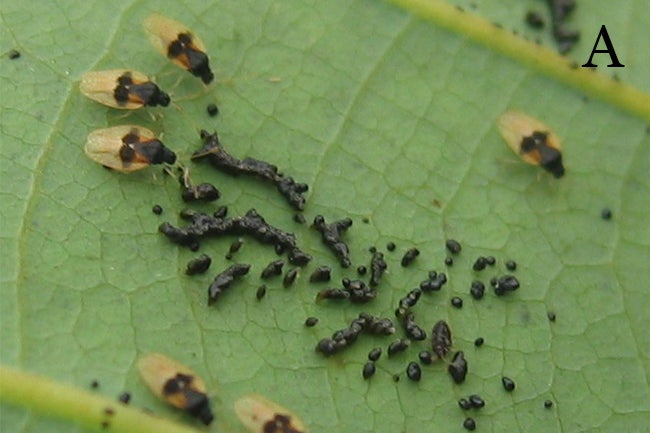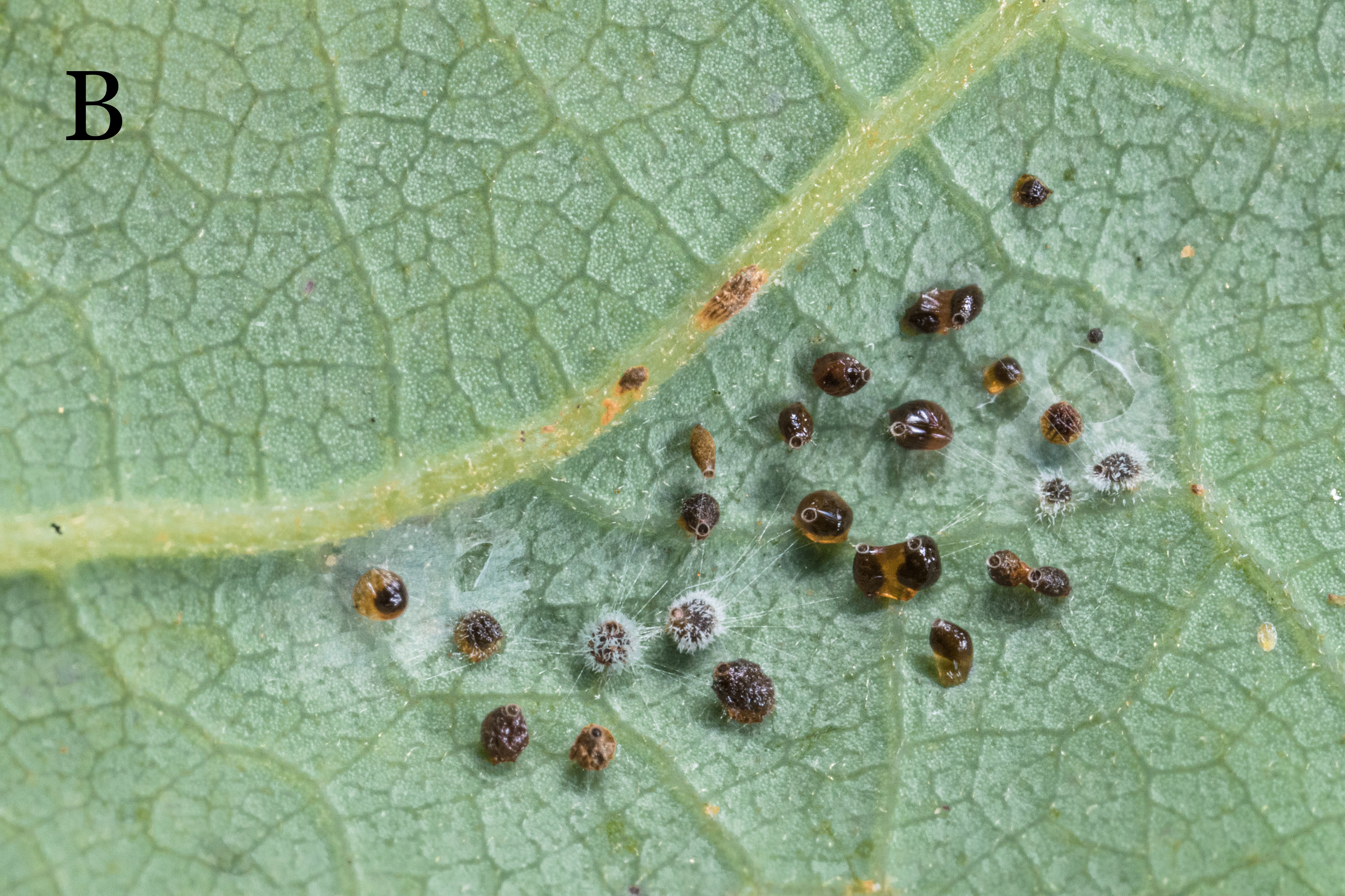 Eggs are laid in an irregular pattern, sometimes in loose rows, stuck to the lower leaf surface and are covered with irregular globules of a black, sticky tar-like substance excreted by adults (Fig. 2A). These sticky exudates may protect eggs from attack by natural enemies. To the naked eye, eggs will appear like grains of black pepper. The eggs hatch into a wingless feeding stage called nymphs and hatched eggs are identifiable by open opercula (Fig. 2B). The nymphs go through gradual metamorphosis shedding their exoskeleton several times as they grow in size, finally developing wings and becoming flying adults. The nymphs are dark red-brown to black and covered with spines (Fig 2C). They feed for approximately two to three weeks before maturing into winged adults, which lay eggs, restarting the life cycle.