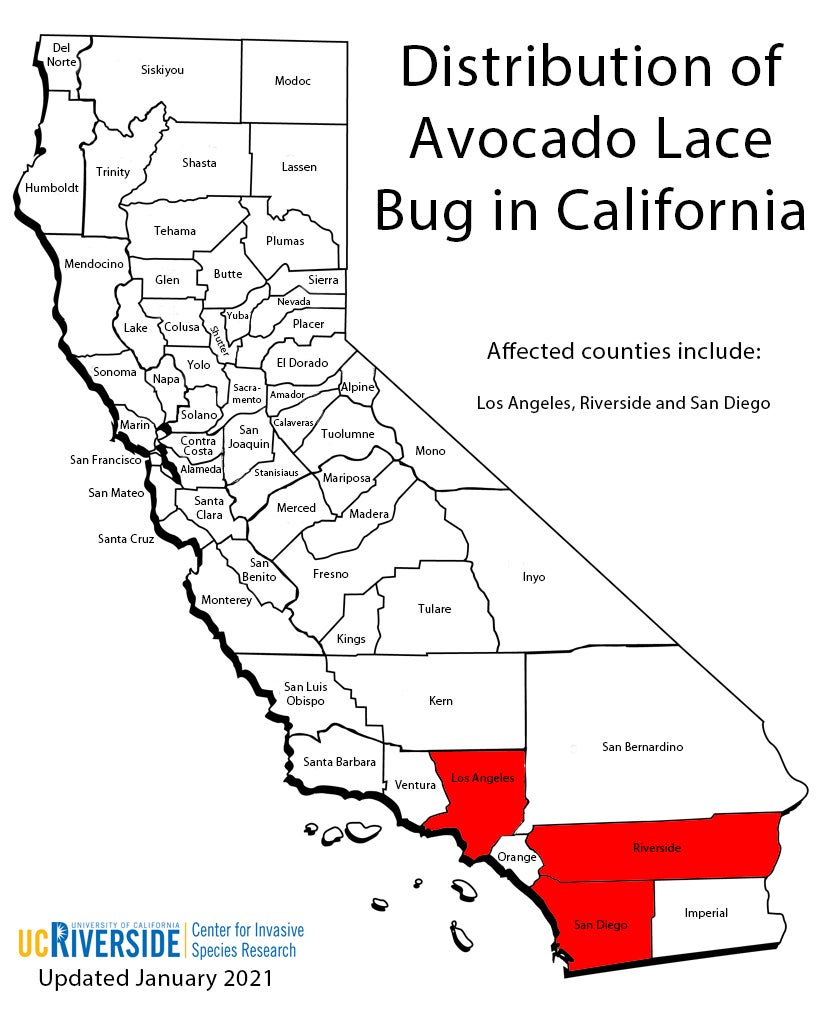 Avocado lace bugs were first detected in California on backyard avocado trees in the Chula Vista and National City areas south of the City of San Diego in September 2004. For more than a decade, ALB populations in California were restricted to backyard avocado trees in residential areas of San Diego County, and as such, was not considered a major threat to commercial production. DNA analyses suggested that these populations likely originated from the state of Nayarit in Mexico (Rugman-Jones et al. 2012).