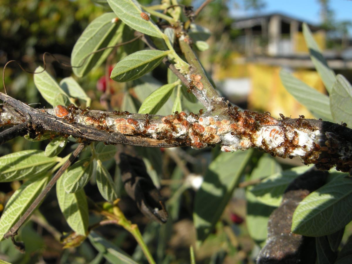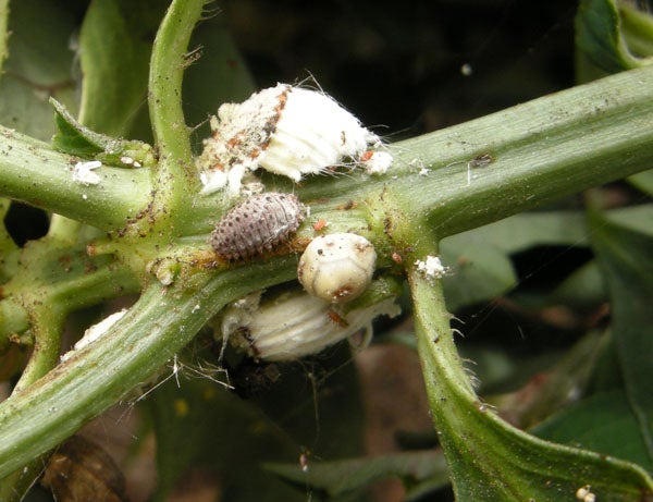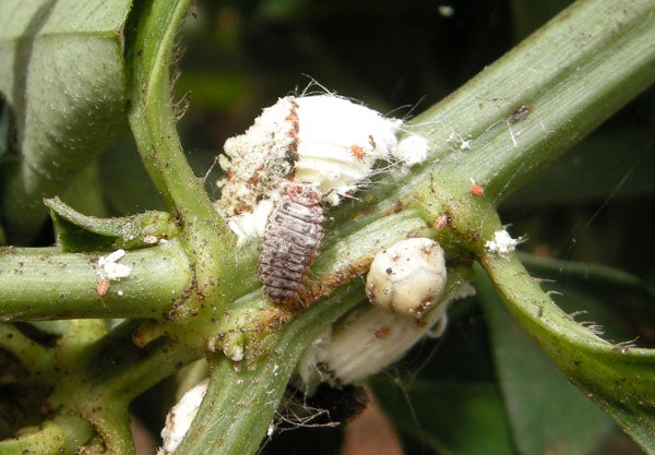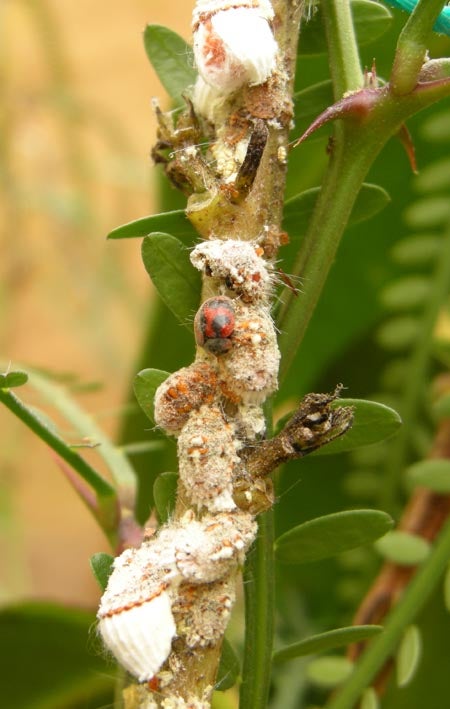 Feeding I. purchasi excrete sticky honey dew. This sugary substance is a waste product produced from feeding on phloem extracted from host plants. Honey dew is a highly attractive food source for ants, and also some species of natural enemies, including R. cardinalis. Depending on the type of plant I. purchasi is feeding on, the quality of honey dew as food source for natural enemies can be vary. For example, when I. purchasi feeds on toxic plants (e.g., Spartium junceum or Erythrina corallodendrum) the honey dew that is excreted is high in alkaloids. The developmental times for larvae and pupae of R. cardinalis are siginficantly higher when they feed on honey dew high in alkaloids when compared to conspecifics that are feeding on I. purchasi honey dew produced from non-alkaloid plant hosts like citrus. Consequently, pest populations can be higher on plants that provide some level of chemical defense against natural enemies.
