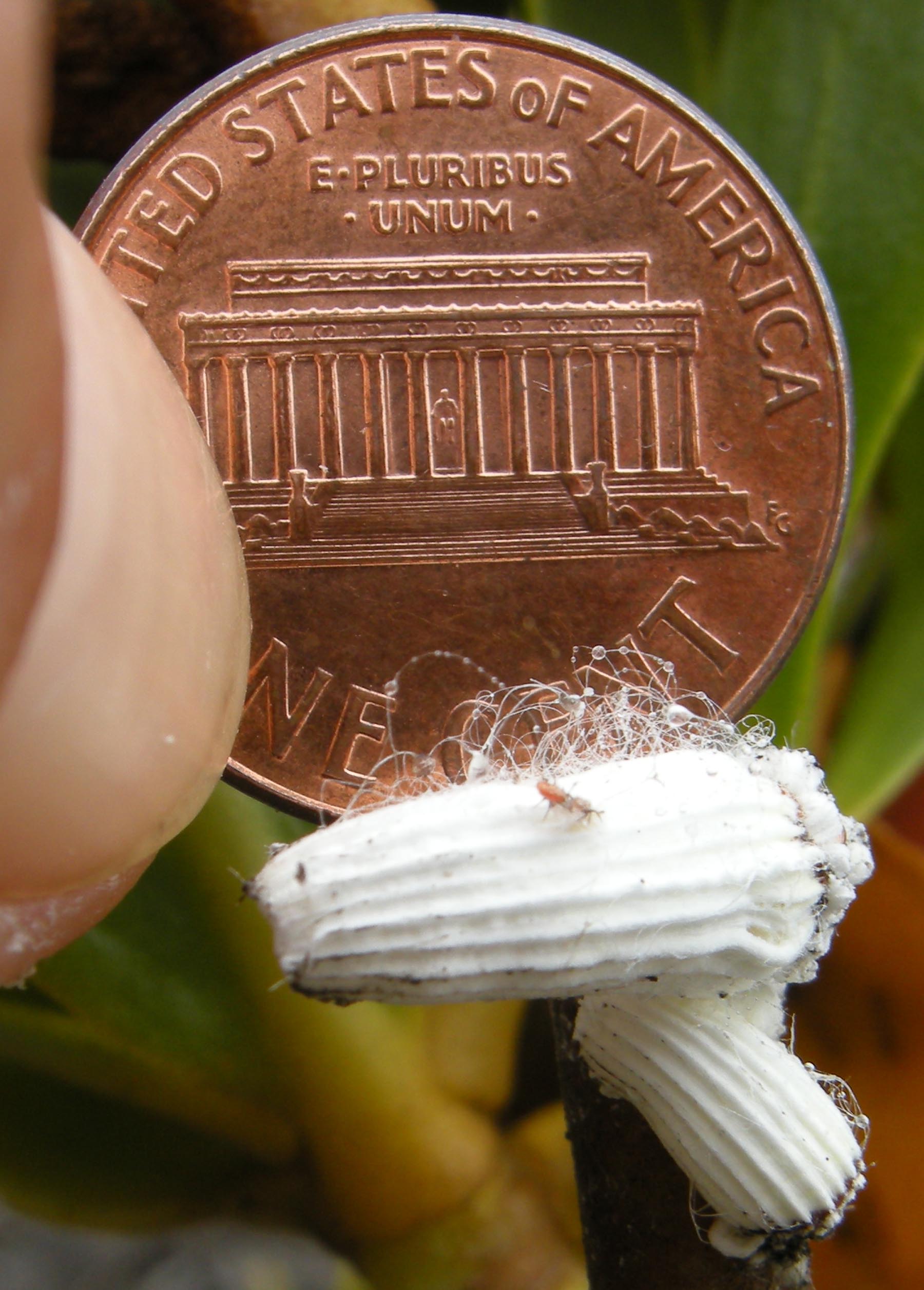 Life cycle. Immature I. purchasi develop within the protective white fluted or grooved wax sac that grows behind the yellowy-orangey-brown colored body of the adult. The egg sac (or ovisac) can be 2-2.5 times the length of the body which can give an adult I. purchasi a length of 10-15 mm. Fertilized eggs are bright red and are discharged from the body into the ovisac. Typically, an ovisac may contain 600-800 eggs, but over 1000 eggs have sometimes been recorded. Dissection and inspection of the ovisac contents under a microscope reveals that there is an obvious age gradient of sac contents. Newly deposited eggs are closest to the body of the adult, mature eggs are in the center of the sac, and at the end of the sac most distant from the adult body, young crawlers can be found. Crawlers emerge from the ovisac as it splits, they have legs and are able to disperse from the adult either by walking, by being blown by the wind, or hitch-hiking on other organisms (e.g., clothing of people brushing against infested plants). Consequently, when heavy infestations of I. purchasi develop on plants it is typical to find all life stages present (reproductive adults, immature larvae, and crawlers).