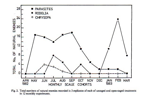 Graph 2. Changes in the phenology or population trends or abundance of key natural enemies that attackI. purchasi over time. When temperatures are cool in Adelaide, Australia (May to December) the parasitic fly C. iceryae is the dominant natural enemy. During the hotter parts of the year (January through March) R. cardinalis is the dominant natural enemy. Graph produced by Y.K. Prasad (1989). |