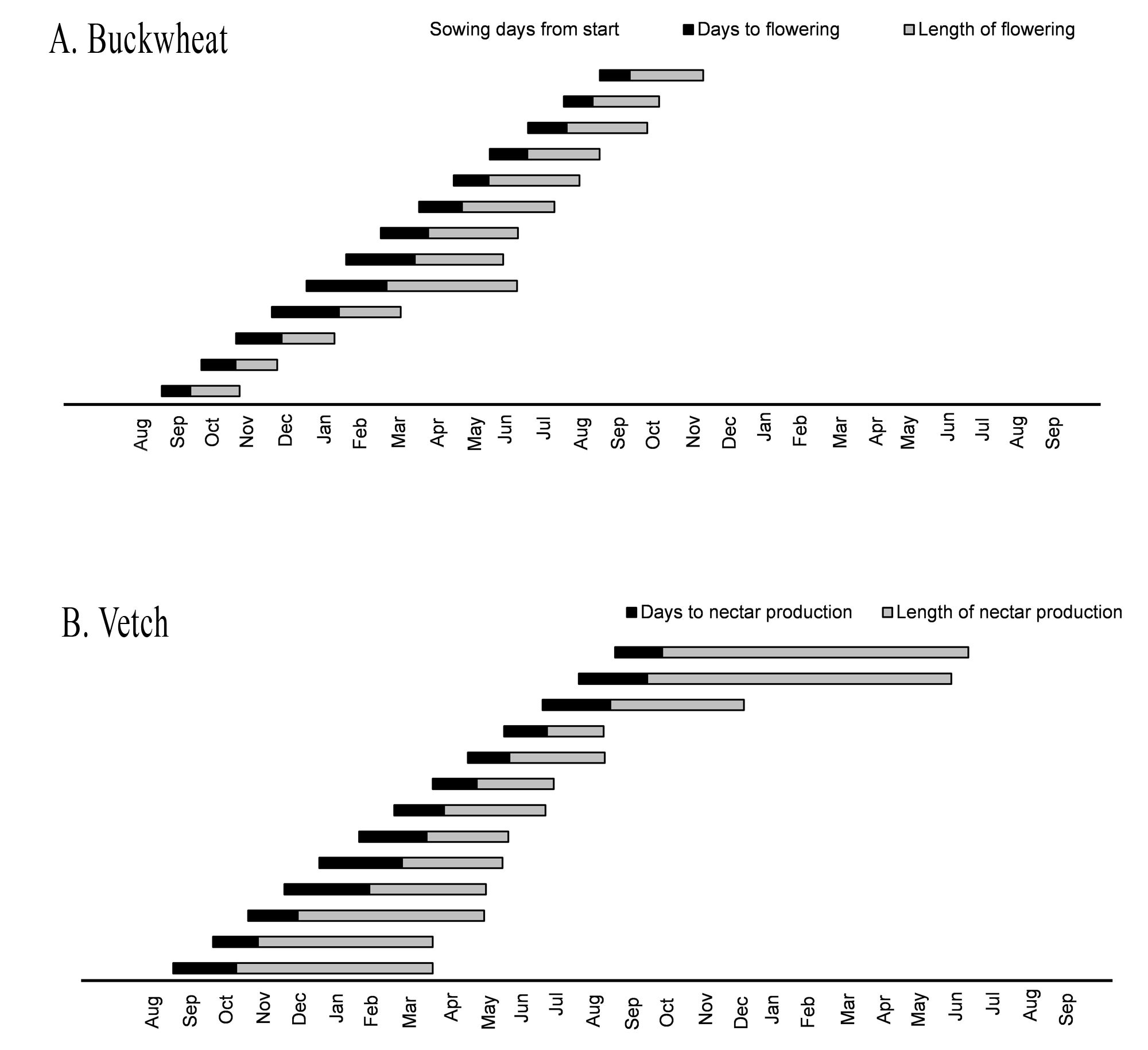 The number of days required from sowing to flowering for buckwheat was shortest between July and August. From April through September it took buckwheat less than one month from sowing to produce nectar-producing flowers. This is information is important for growers intending to synchronize buckwheat nectar production to the phenology of natural enemies of key pests. Vetch took 0.6-28 days longer each month to start producing nectar compared with buckwheat. Buckwheat, therefore, may be a better cover crop for growers seeking a quick-growing plant that will provide a supplemental nutrition source for natural enemies, particularly in the summer months when buckwheat produces nectar nearly one month faster than vetch. Conversely, once extrafloral nectaries developed on vetch plants, they produced nectar for up to 5 months longer than buckwheat flowers. This trade-off between speed of floral production and longevity of floral production suggests that mixed-species sowings may be useful to take advantage of both quick-flowering species as well as species with long flowering periods.
