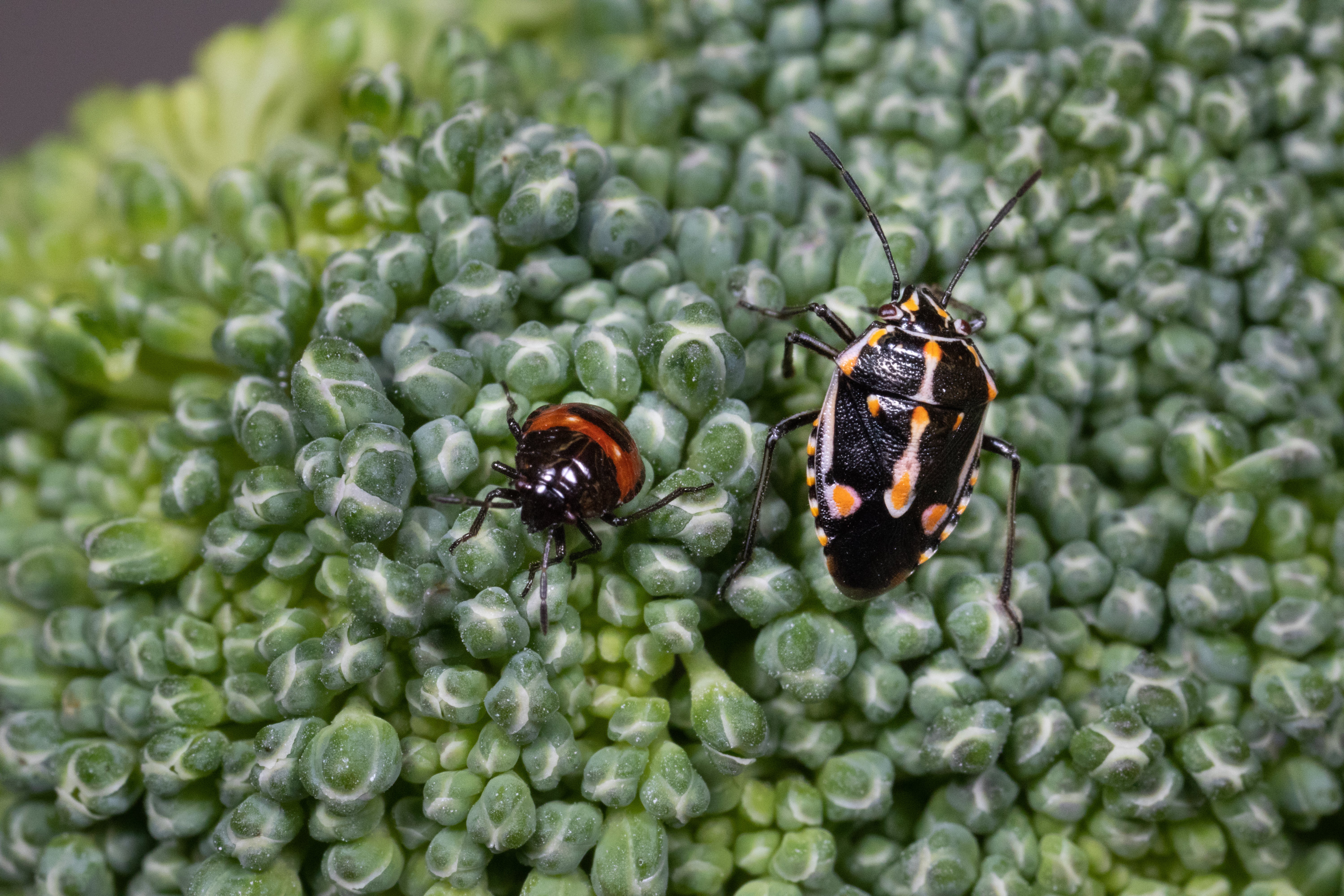 Thrilled with the opportunity to return to school herself, she returned to the idea planted by Dr. Young of studying biological control at UCR. Here she is investigating Ooencyrtus sp., a tiny (< 1mm) wasp from Pakistan that is a parasitoid of the eggs of bagrada bug, a species of stink bug (Pentatomidae). Also called painted bug, Bagrada hilaris first appeared in the U.S. in L.A. County in 2008. It quickly became a major pest on broccoli and related crops, and spread to other counties and states. To evaluate the wasp’s potential as a biocontrol agent of bagrada bug, Nancy is exploring the Ooencyrtus species’ host specificity by testing its ability to reproduce on the eggs of alternate hosts. She is also investigating the lifetime fecundity and longevity of the wasps, to see if it can multiply faster than bagrada bug. Furthermore, to determine optimal mass rearing conditions, she compared the growth rate of immatures at several different temperatures, and tested the effect of different ages of the parasitoid and the host eggs on reproductive success. Her final experiment will be to consider how the wasps find host eggs on plants and in soil, where the bugs lay them.