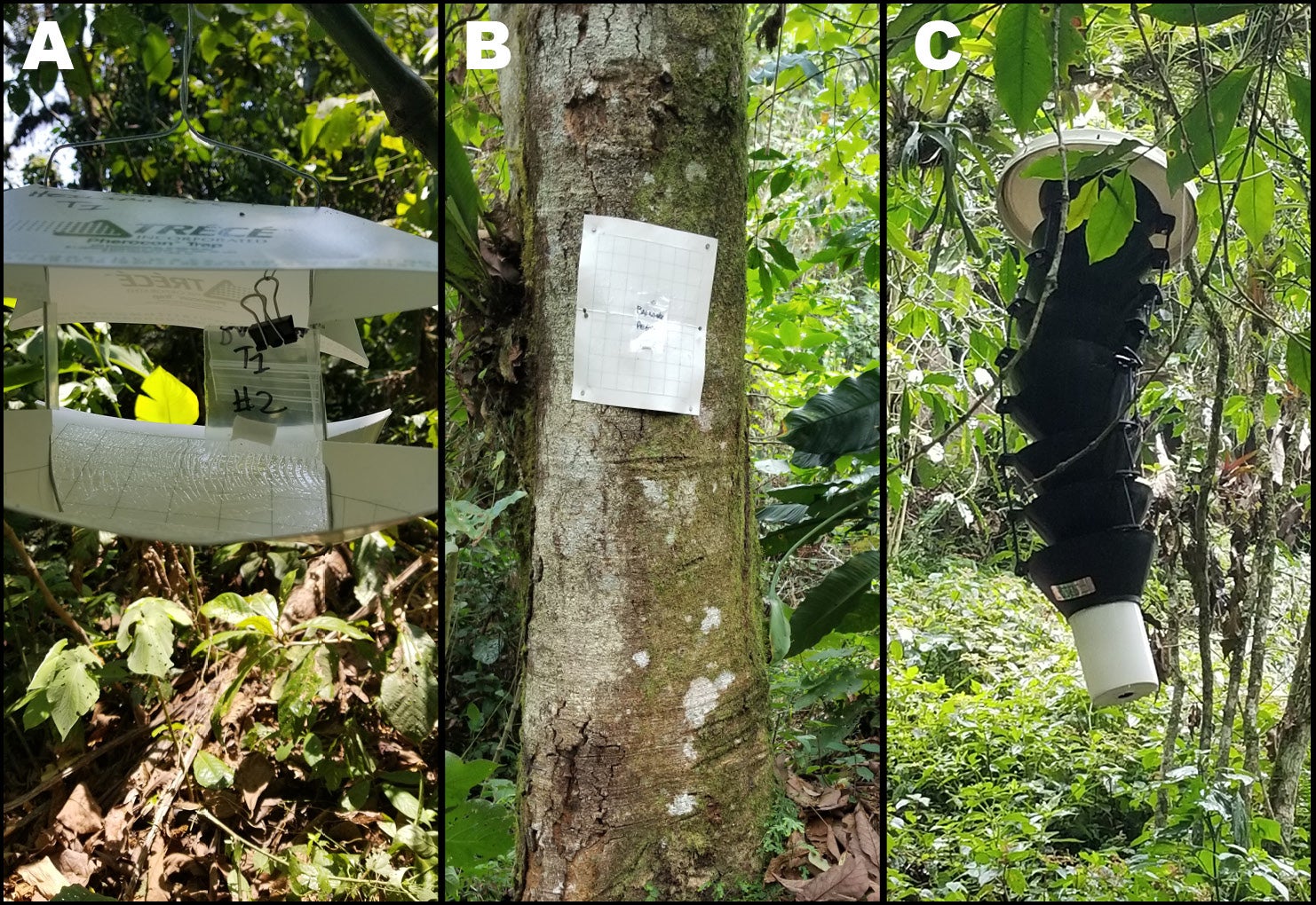 Five different treatments were deployed at each site within La Barranca (Fig. 14) consisting of: (1) a wing trap and synthetic grandisol in a baggie (Fig. 15A), (2) White panel trap nailed to tree truck with synthetic grandisol in a baggie (Fig. 15B), (3) Lindgren funnel trap with synthetic grandisol in a baggie (Fig. 15C), (4) wing trap with wick and baggie and no pheromone (control), and (5) commercially available boll weevil pheromone lure in a wing trap.