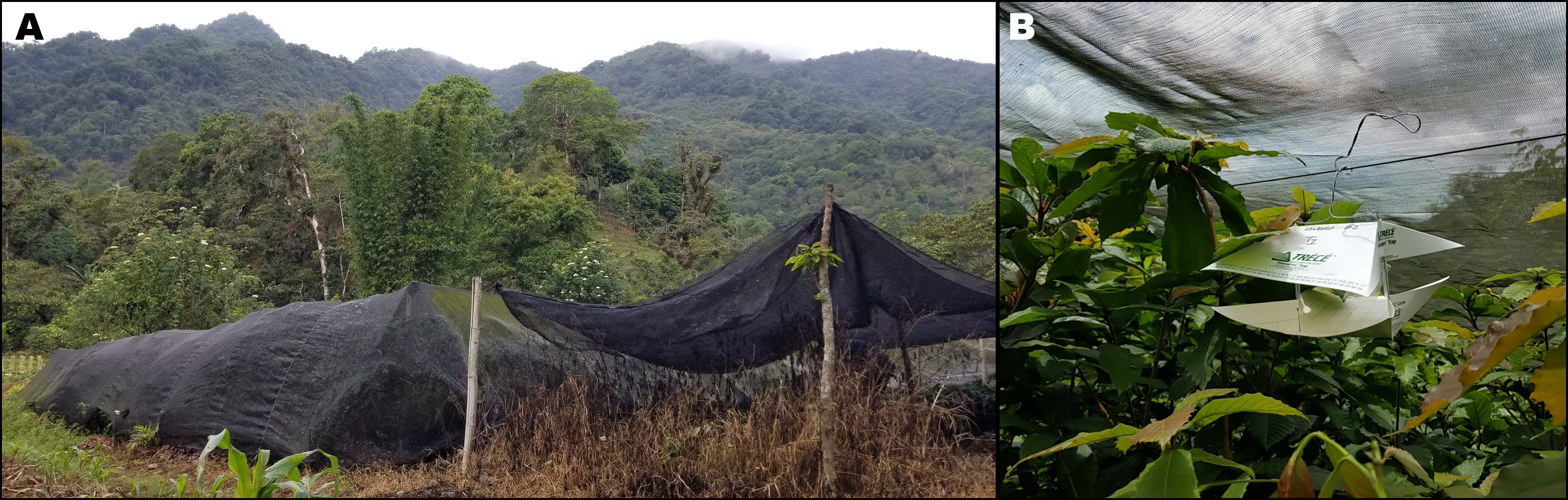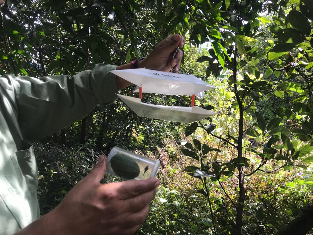 Phase 6: Field Tests with Caged Live Mating Pairs of Adult Weevils: In October-November 2022, another set of experiments was set up in Mexico. Twenty one pairs of adult laboratory-reared weevils between 1 and 2 months of age were caged in ventilated vials with small avocado fruit to feed on and placed inside wing traps deployed at three field sites (Fig. 21). The goal of this work was to verify that the weevils were indeed releasing and using volatile pheromones to attract conspecifics. After four weeks the trial was terminated as no weevils were trapped and all adults inside ventilated vials were alive. These negative results do not necessarily mean that weevils are not releasing and responding to an aggregation pheromone. It is possible that caged mating weevil pairs do not release grandisol to attract conspecifics if they are already mated or in the process of mating.