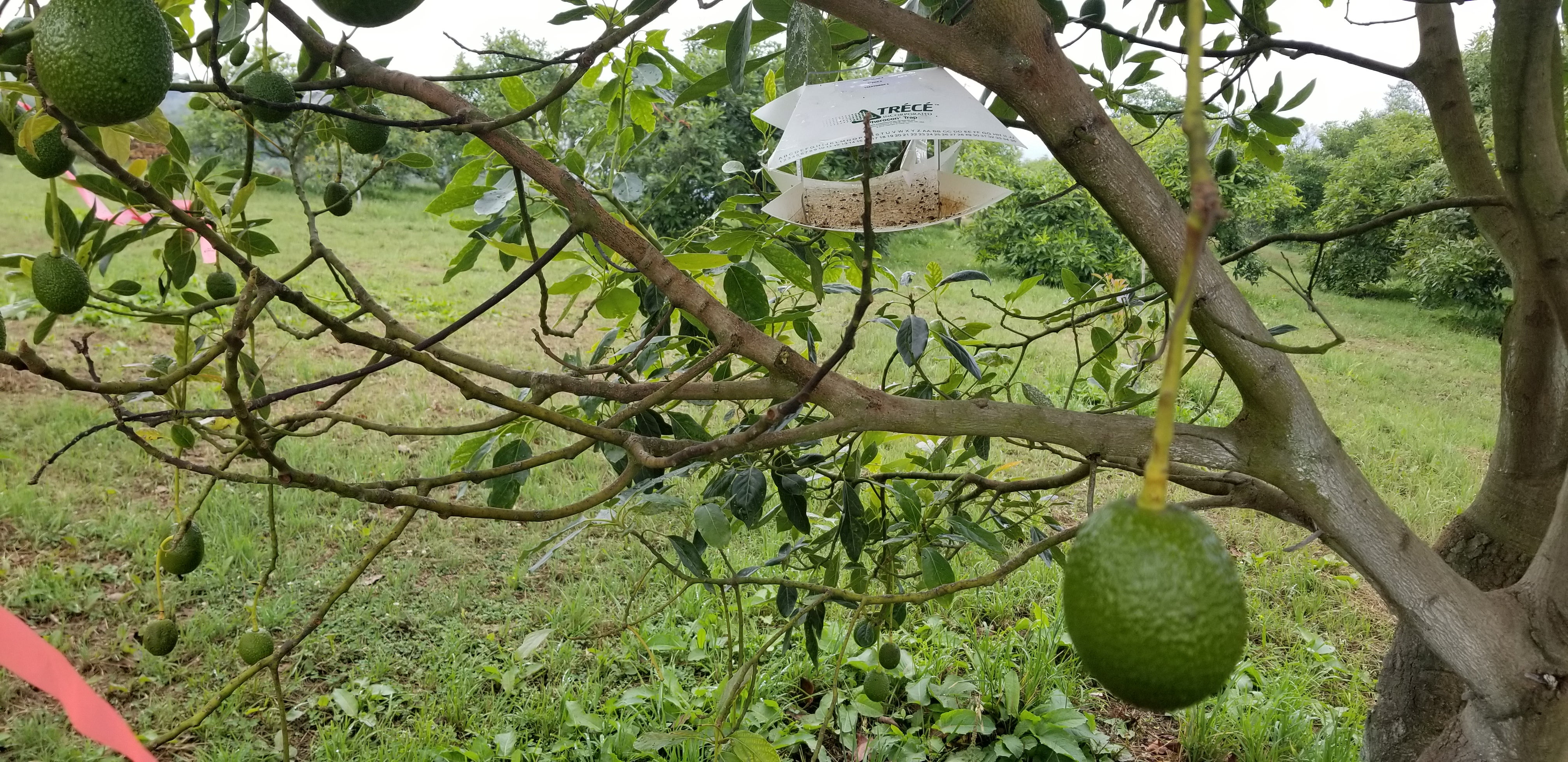 A review of literature on using pheromones to trap weevils indicated that trap color and trap design (e.g., sticky panel traps nailed to trunks and branches) can have significant impacts on trapping efficacy. In July 2022, a four week trial in three commercial but very poorly managed Hass avocado orchards in State of México was set up (Fig. 19). This study site is ~300 miles from Huatusco, and very close to where the original weevils used for pheromone work in the UCR I & Q facility were collected. Weevil damage to fruit across all three orchards by visual observation of 210 hanging fruit was estimated at 63%.
