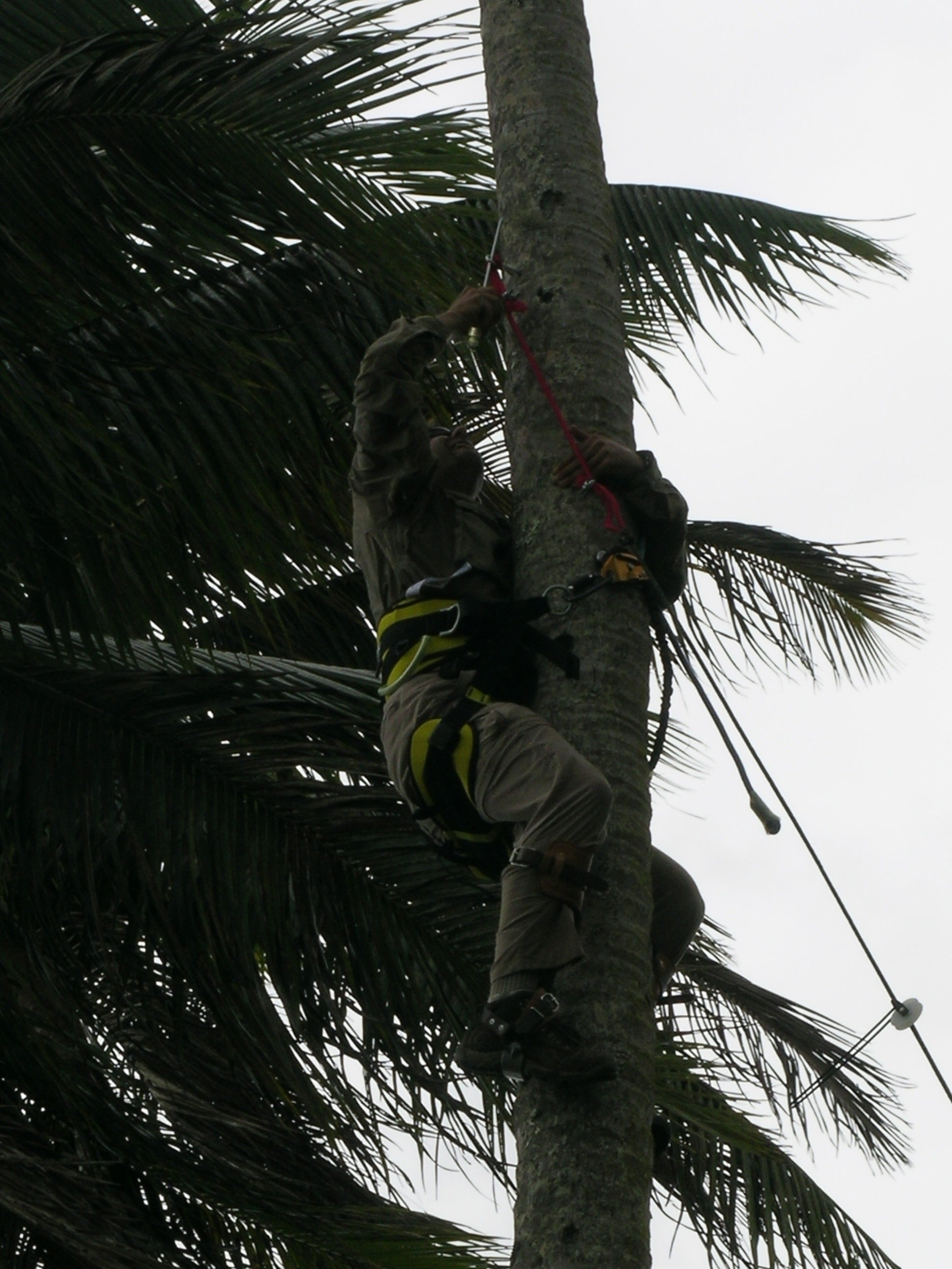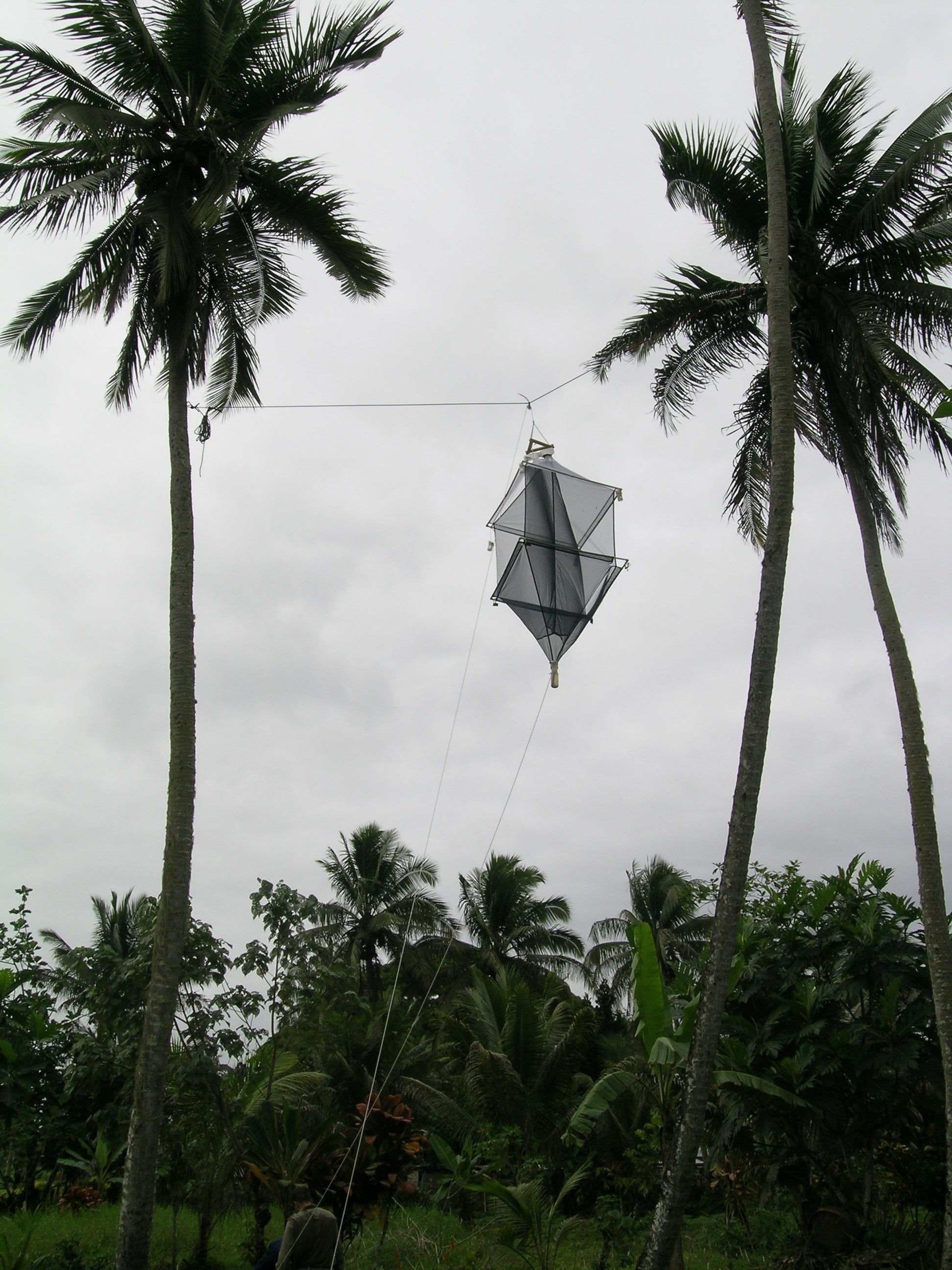 With this attack sequence in mind, aerial malaise traps were deployed at Serea, Taulevu, Vunindawa, and Toga Island near Nausori on the Rewa River Delta over the period October 5–31, 2004. Traps were suspended on ropes 20-25m above the ground between adjacent coconut palms and immediately under the palm crown. Traps were lowered on a rope pulley system and collection bottles with 95% ethanol were checked every 3-4 days for L. iridescens, H. dolens, and B. remota over a four week period. None of the target species were collected.