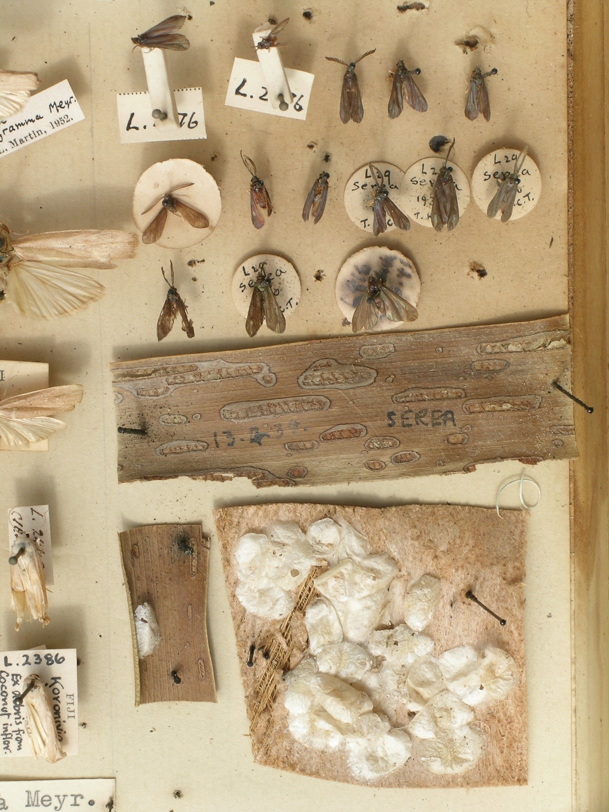 Howarth's (1991; 2001) claim that L. iridescens was extinct by 1929, but may have persisted until the 1950's and that the endemic H. dolensis extinct in Fiji (Robinson 1975) was investigated by searching library accessible literature records and Fijian insect collections. In October 2002 and 2004, the author examined the insect collection at the Koronivia Research Station near Suva on Viti Levu, Fiji, for L. iridescens and H. dolens. The Koronivia collection has 14 specimens of adult L. iridescens; eight specimens have collection data, the remaining six are unlabeled. There are two L .iridescens cocoon samples on vulu, one is a single cocoon and the other is a mass of approximately 20 cocoons. One sample of larval L. iridescens trenching on the underside of a coconut leaf approximately 5 cm x 1.3 cm in size with around eight trenches has been preserved. The trenched leaf was collected in Serea, Viti Levu, April 13, 1939, the collector is not named. The most recently lodged specimens of adult L. iridescens were collected in December 1953, at Taulevu (due west of Vunindawa) on Viti Levu. Larvae were also collected from this L. iridescens outbreak in Taulevu that affected 100 coconut palms. The larvae were not located in the Koronivia collection. The most recently deposited specimens of Heteropan dolens are two adults collected from Taulevu in 1963. Detailed collection data for L. iridescens and H. dolens are provided. In October 2004, a large number of unlabeled Schmidt Boxes and Cornell Drawers were inspected in the Koronivia Collection for “undiscovered” L. iridescens and B. remota specimens. The search yielded six additional L. iridescens, and one cocoon sample. All of this “new” material was unlabeled so collection date and locality are unknown. Two of the best unlabeled adult L. iridescens specimens were returned to the Entomology Museum at the University of California at Riverside for long-term curation. The overall condition of the specimens in the Koronivia Collection is extremely bad and further deterioration will occur without immediate efforts aimed at preservation.