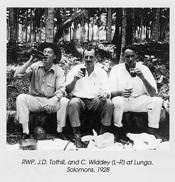 | Figure 4. J.D. Tothill (center) and his two associates, R.W. Paine (left) and C. Widley (right) at Lunga, Solomons (1928). |