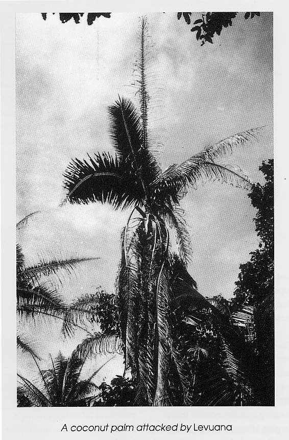 Vulu stripping. Vulu is the thatch or fiber matting that connects the bases of coconut fronds. Levuana iridescens larvae preferentially pupate in vulu. During Levuana outbreaks, densities of pupating larvae in vulu could become so great that cocoons would be spun over the top of existing cocoons rending emergence impossible for larvae in lower strata (Tothill et al., 1930). Manual removal of vulu as a pest suppression tactic was considered, but quickly abandoned due to the intensive amount of labor required, and the difficulty of quickly ascending and descending tall coconut palms. Additionally, vulu removal destroyed habitat used by beneficial arthropods such as spiders that preyed upon pests (Knowles 1909).