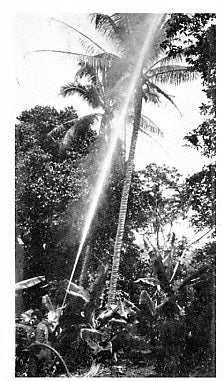 Application of sprays to tall palms involved either the use of a power-driven pump or the erection of scaffolding around each palm to be treated by hand. A major shortcoming associated with power application of wet sprays to tall coconut palms was the enormity of wasted spray to provide adequate coverage of infested coconut crowns. Costs associated with the employment of spray crews (Knowles 1919) and scaffold erection and movement were prohibitively expensive for hand applications that treated palm crowns at close range (Knowles 1919). Small coconut palms were successfully hand-treated for L. iridescens with kerosene emulsions or resin washes (Froggatt 1914) and applications of 30 oz of lead arsenate in 25 gallons of water applied at a rate of 4 gallons per palm with applications repeated at 5 week intervals also controlled larvae on small palms (Jepson 1915).
