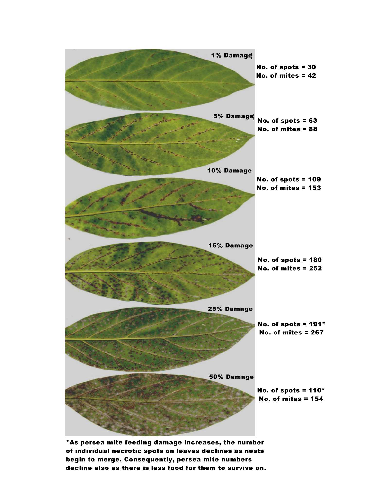 Persea mite densities can also be estimated by visually assessing damage levels on infested leaves. The use of photographs with known levels of damage, mite densities responsible for observed levels of damage, and the number of necrotic spots resulting from mite feeding can be used in treatment decision-making. Colored photographs of avocado leaves showing 1%-50% feeding damage and the numbers of persea mites required to cause recorded amounts of damage are shown in Diagram C.