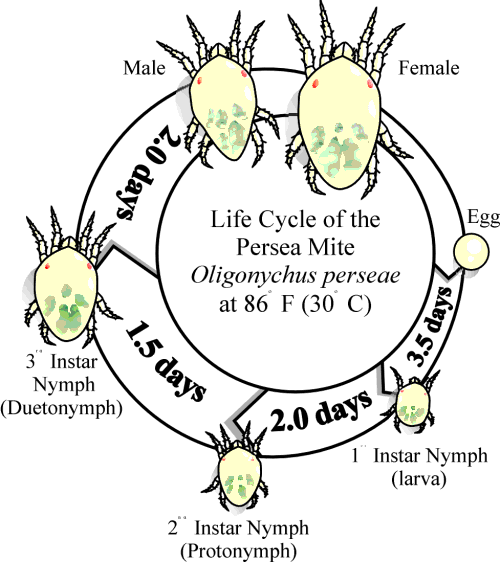 Biology of the persea mite. Persea mite has five developmental stages (egg, larva, protonymph, deutonymph, and adult). All lifestages are predominantly found in nests where feeding, mating, reproduction, and development occurs. Sex ratio is generally two females to one male. A generalized life cycle for persea mite is shown in Diagram A, and Table 1 summarizes important aspects of persea mite biology.
