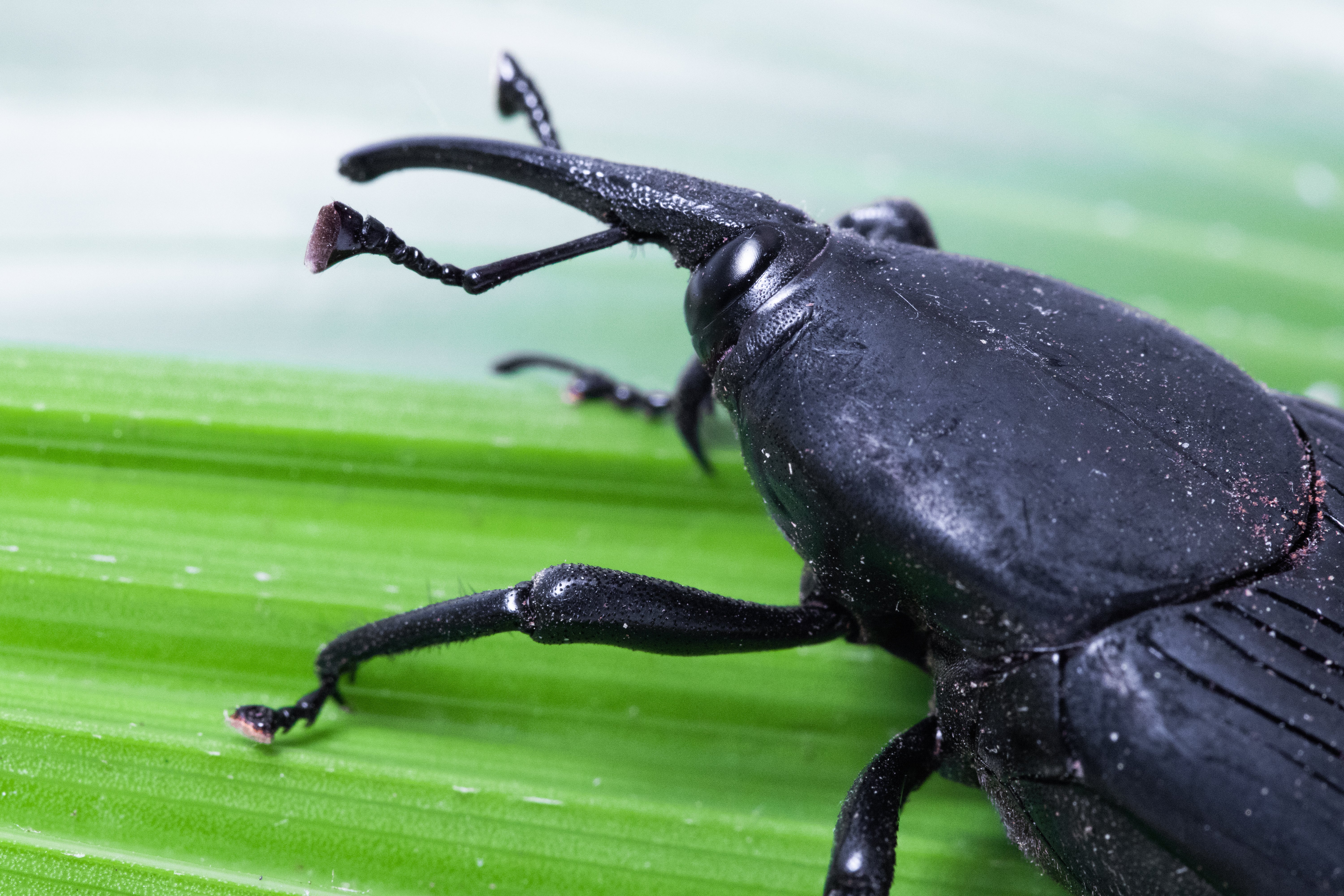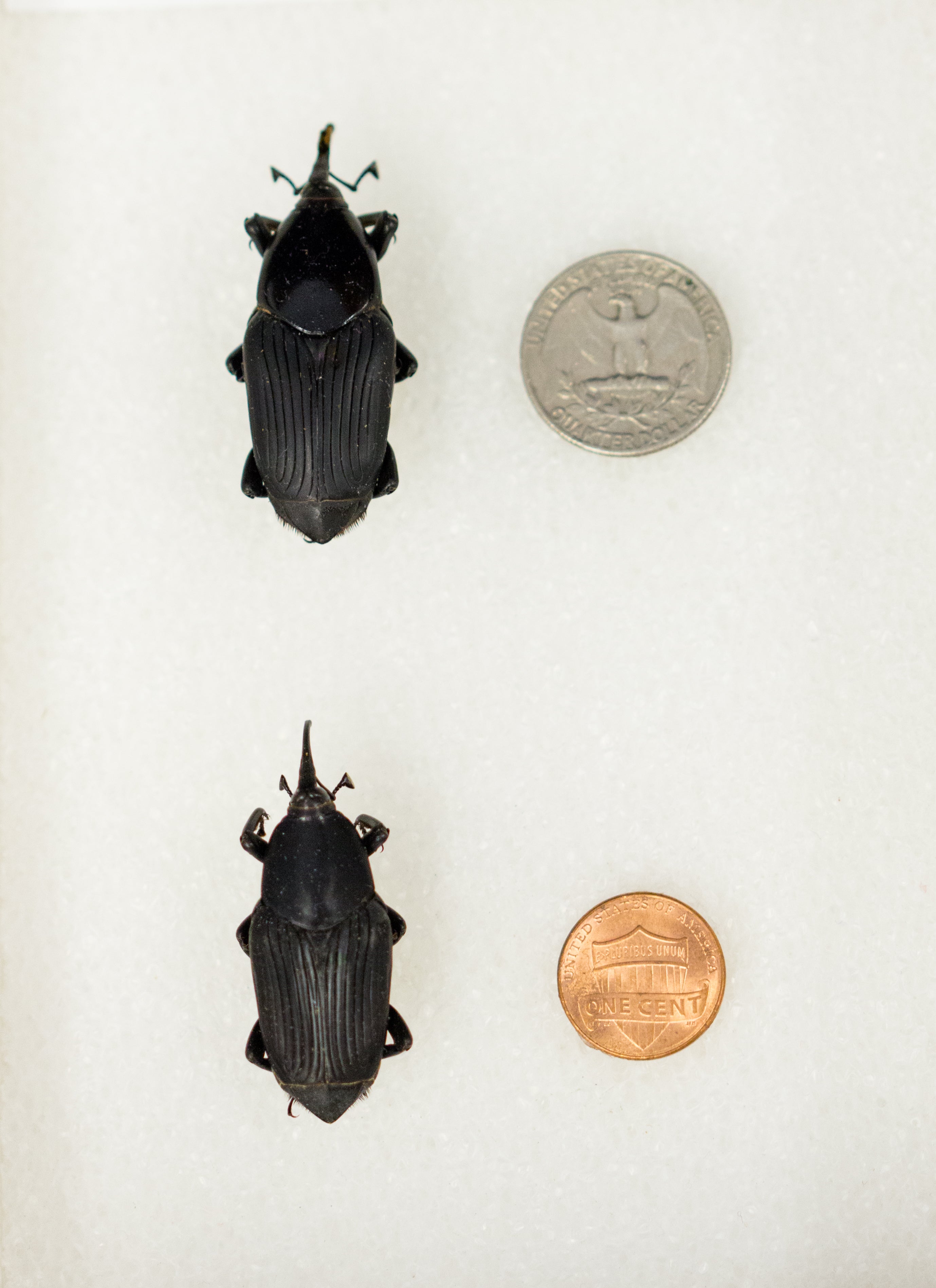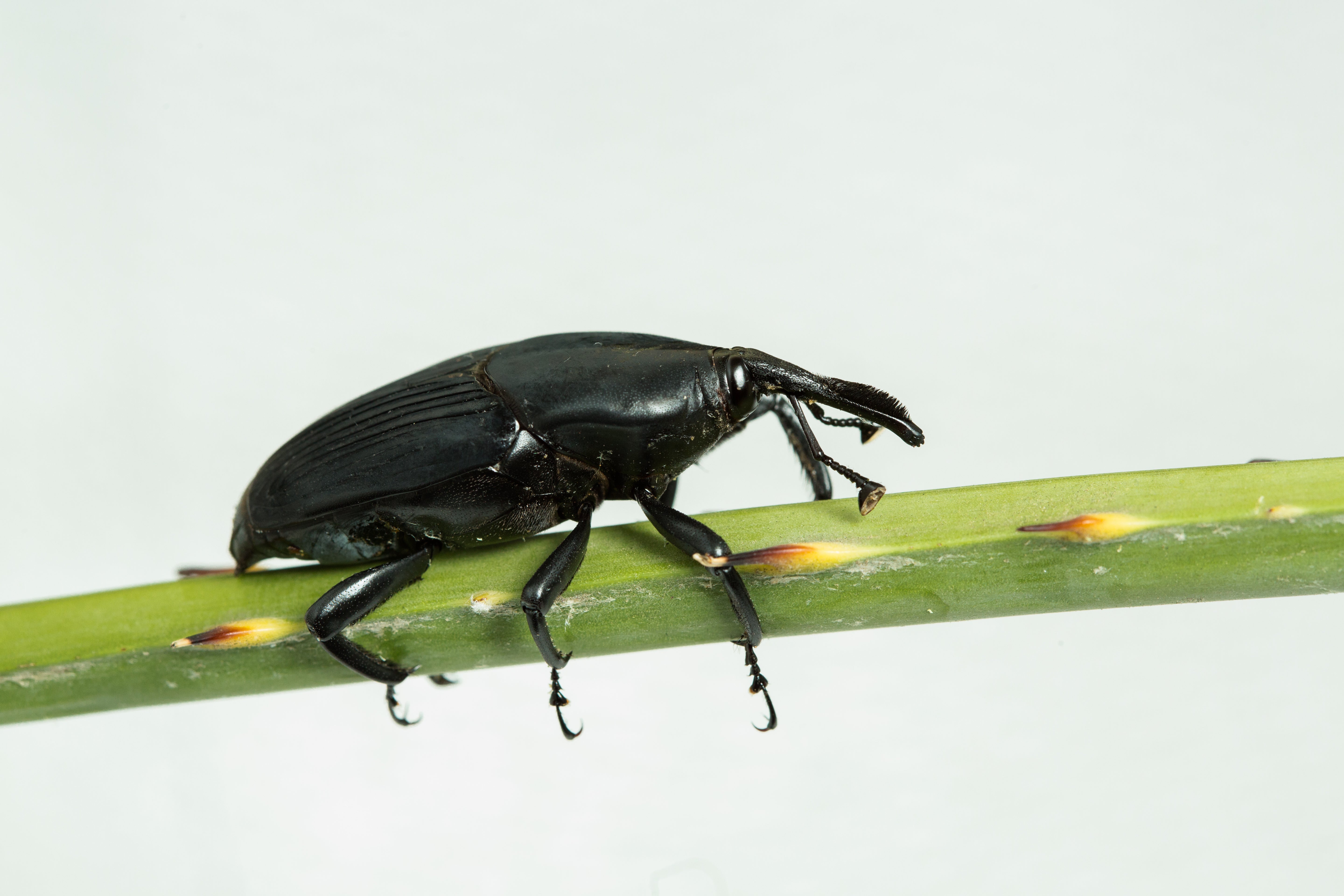 Adult SAPW use their mandibles (i.e., “teeth”) at the end of the rostrum to chew their way out of the cocoon, they are typically black, and live for 1-2 months. A small percentage of the adult population may have orange and black markings that are very similar to another notorious palm pest, the red palm weevil, Rhynchophorus ferrugineus. These orange and black morphs of SAPW have been found in California.