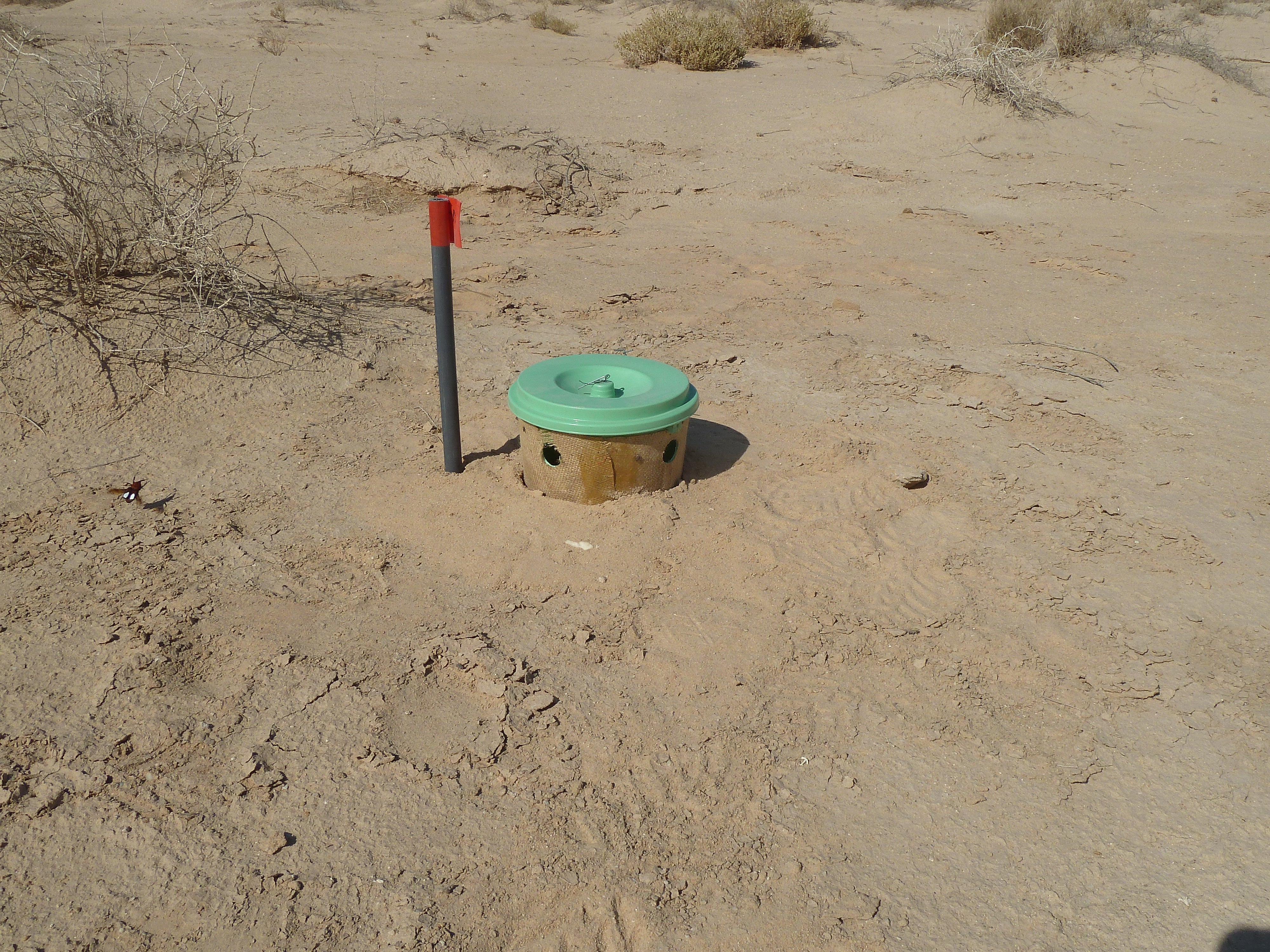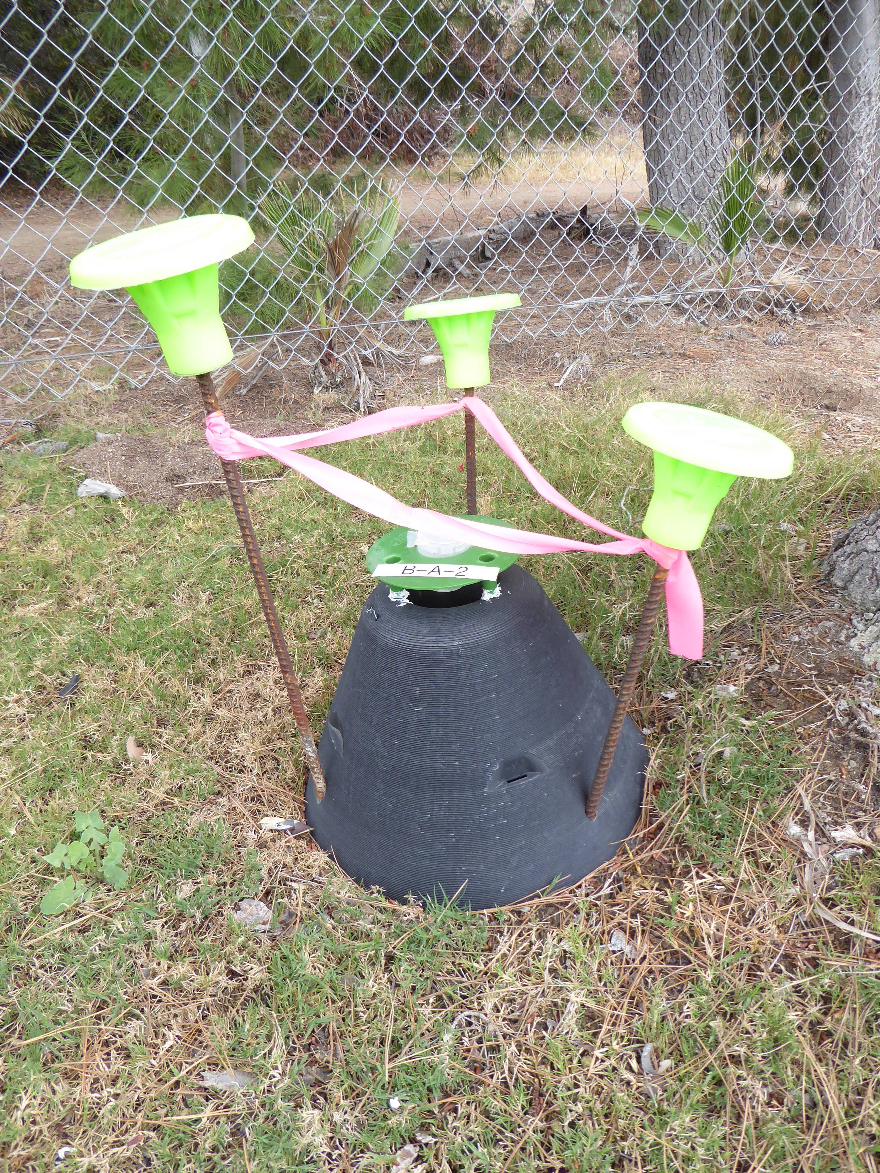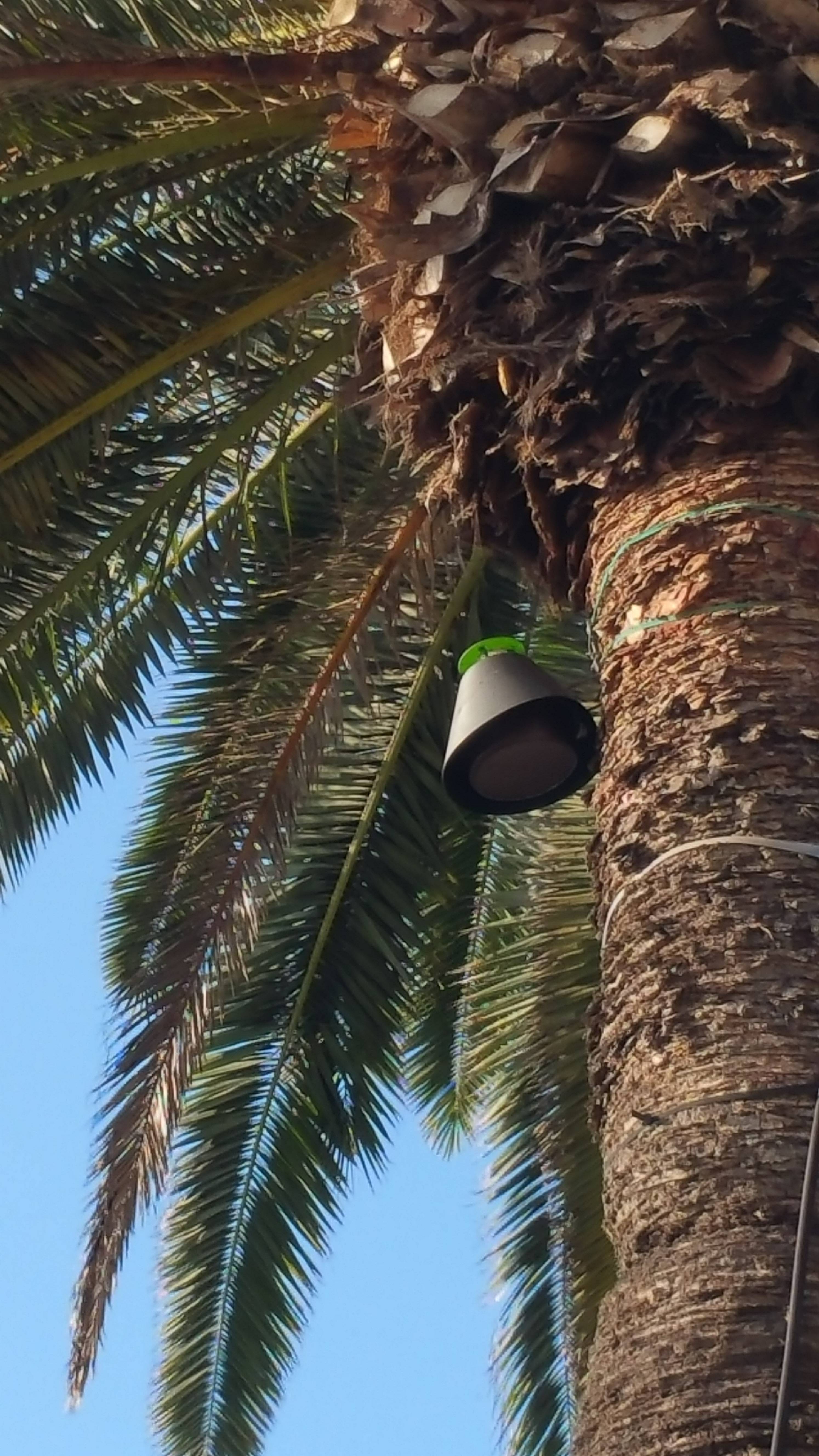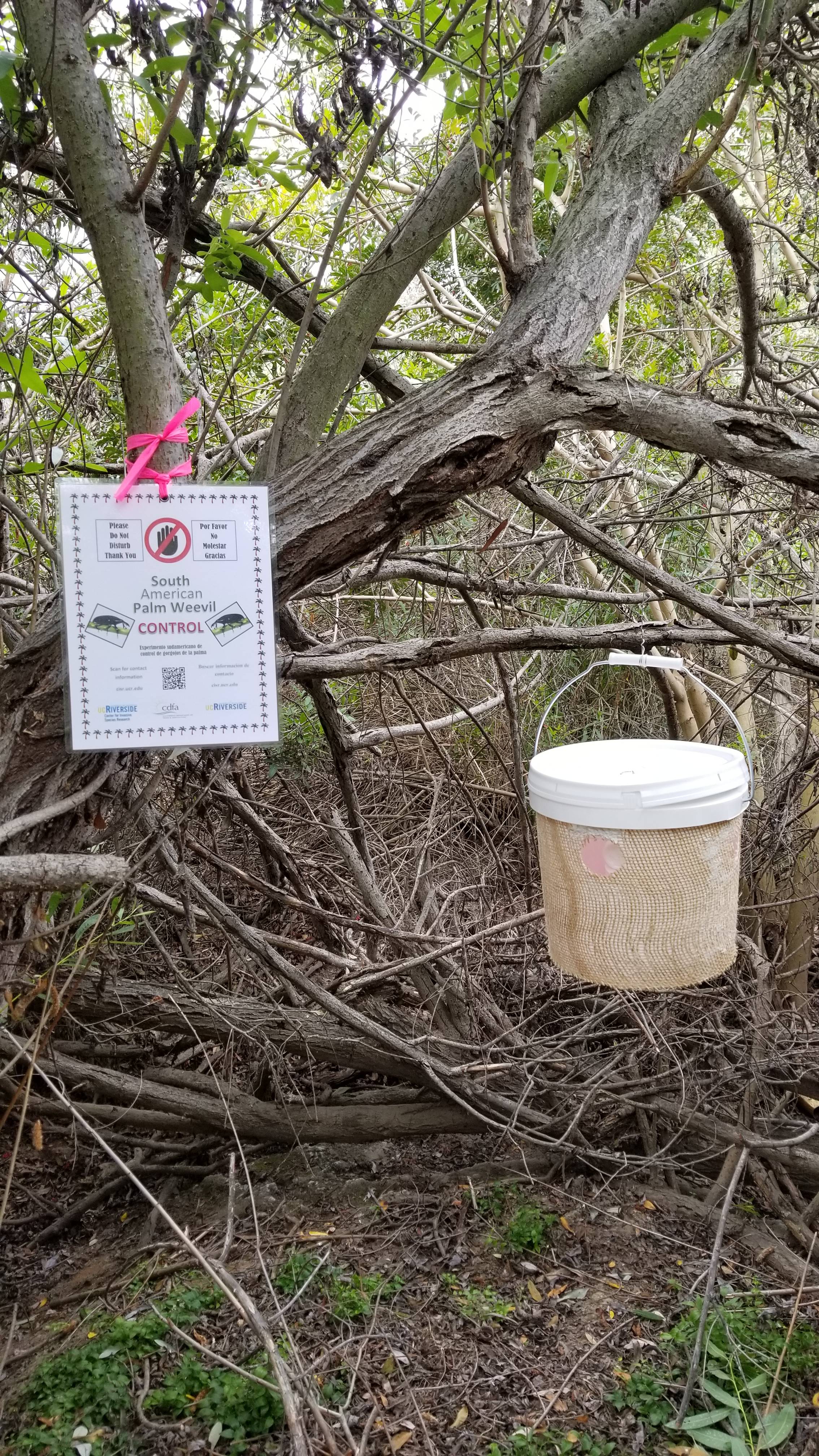 Trap placement is important for detecting weevil activity in an area of concern. Studies on red palm weevil in Europe have contributed to the following recommendations for trap placement for SAPW in California. Traps should not be hung from palm trees or placed near (i.e., within 500 yards) palms of interest. Traps are not 100% efficient in capturing weevils. If traps are placed too close to palms adults that are attracted to traps but are not caught may start infestations in the palm that is being monitored. If detecting low levels of palm weevil activity in the general vicinity is the goal of the monitoring program, traps should be deployed outside (perhaps > 0.5 mile away) of the immediate area of concern. If weevils are captured at this distance from the palms of concern it likely indicates that weevil activity is close and steps should be promptly considered and implemented for protecting those palms. Trap efficacy is maximized if traps are placed in areas with partial or full shade. Full sun exposure, especially during the hottest parts of the day, rapidly diminishes trap potency.