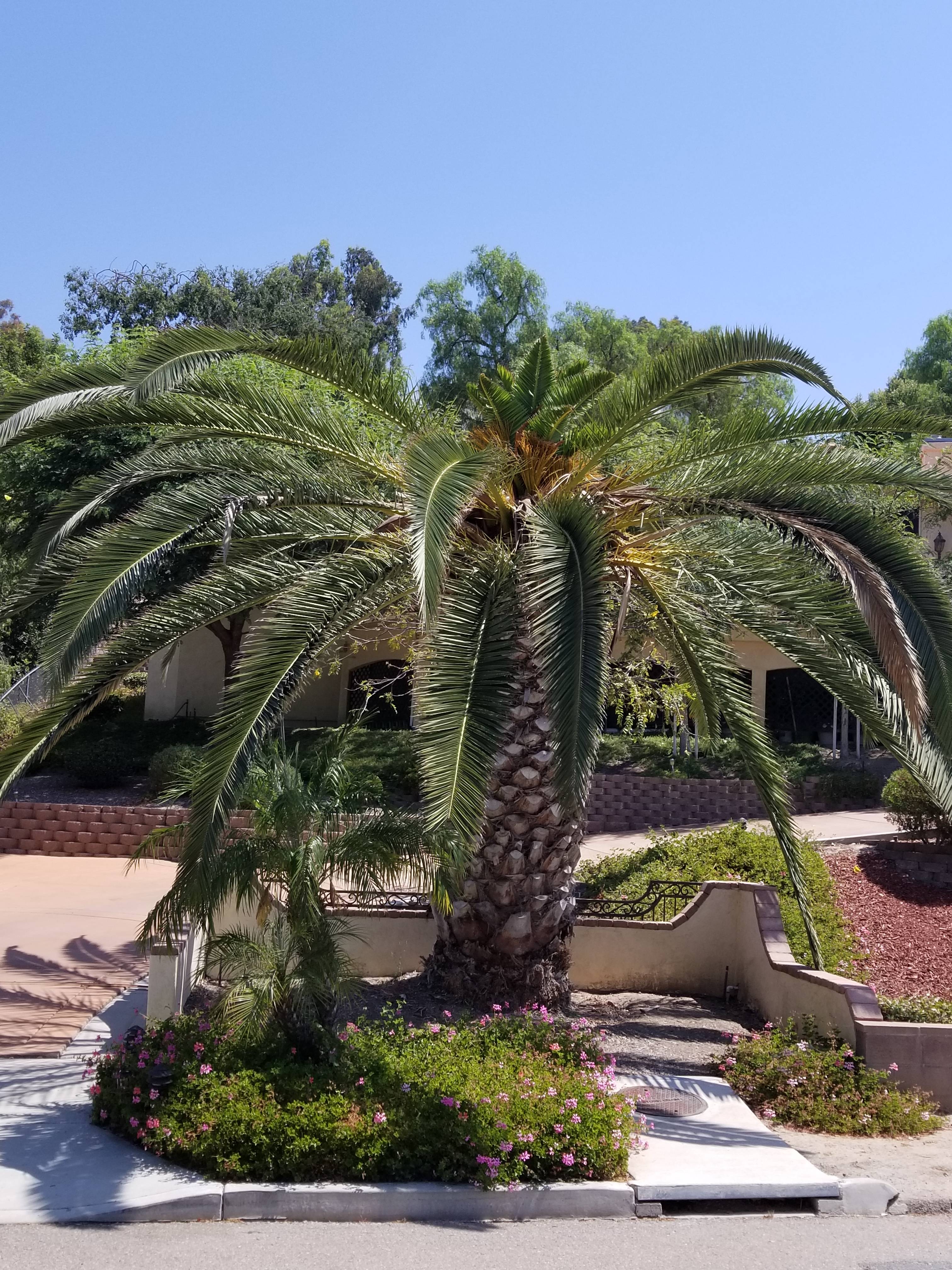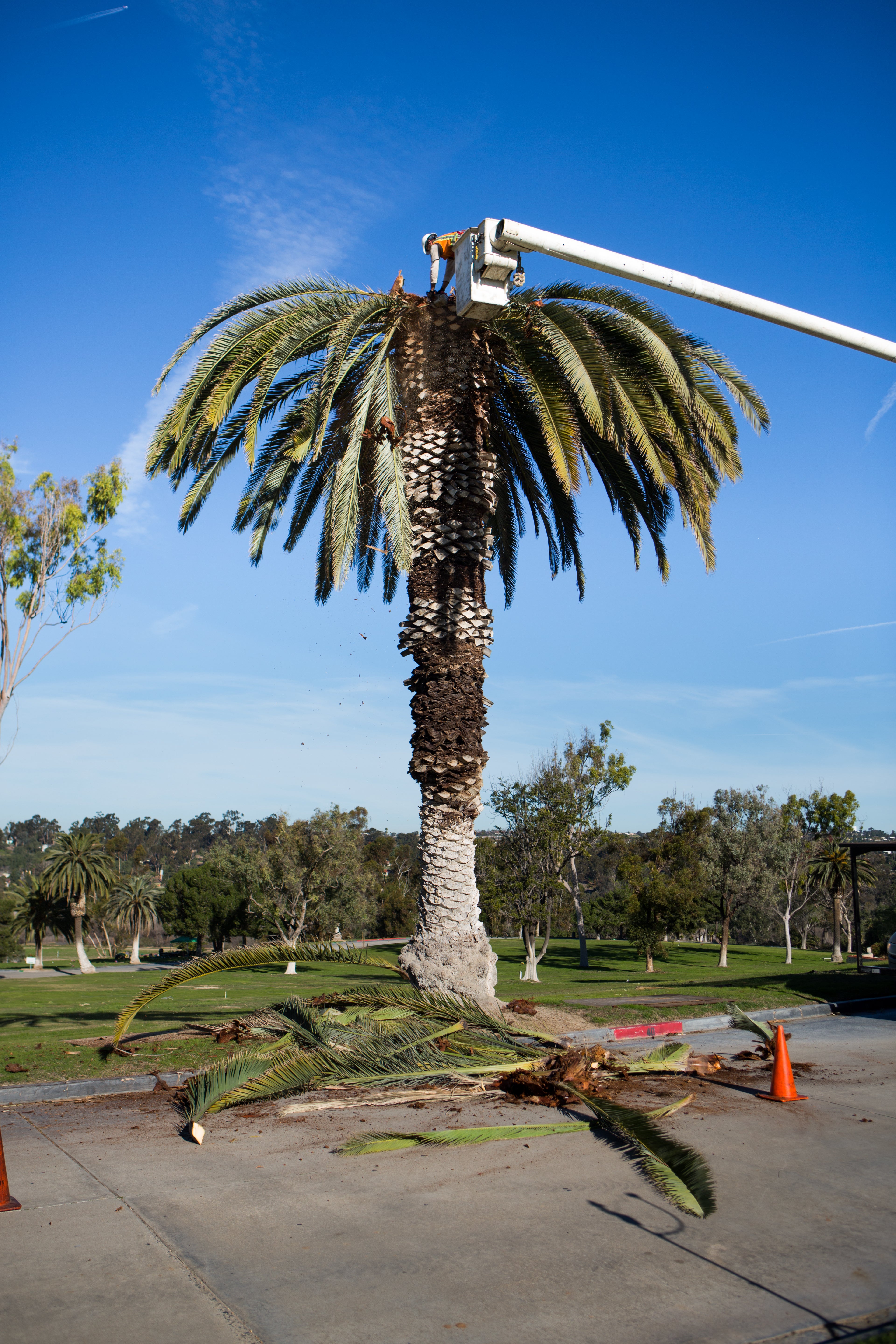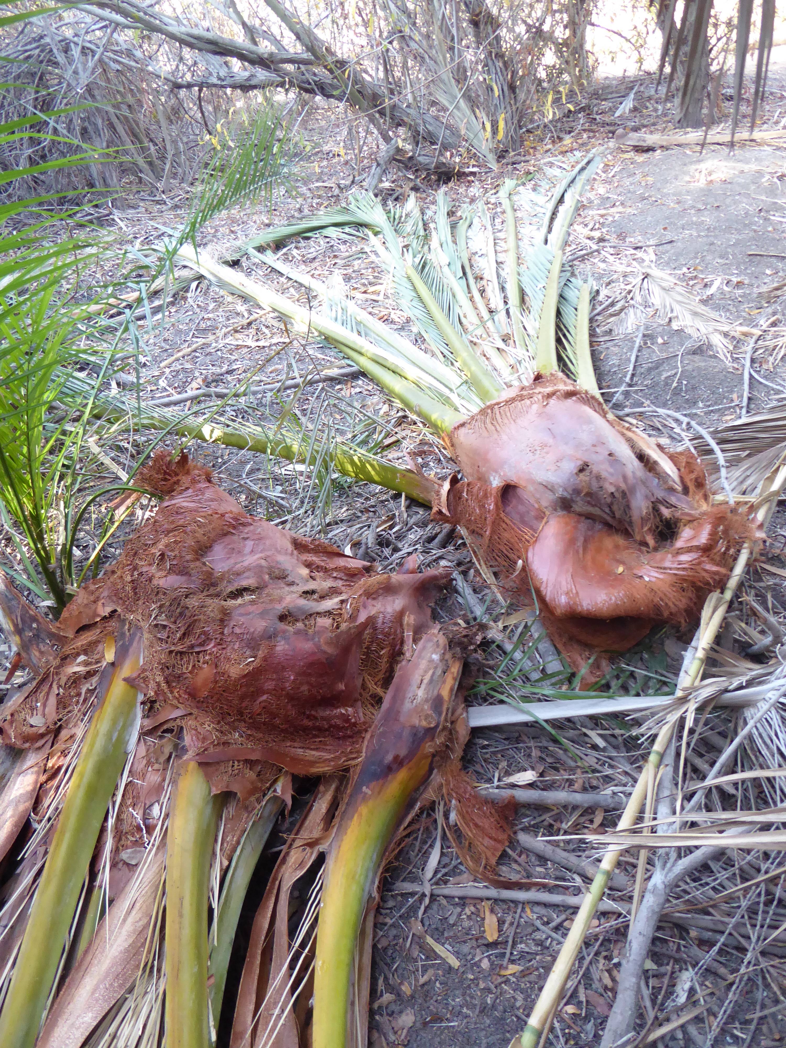| (A) A dropped Canary Islands date palm crown that rolled down the street after being killed by SAPW. (B) Dropped Canary Islands date palm crown in a reserve in San Diego County | |