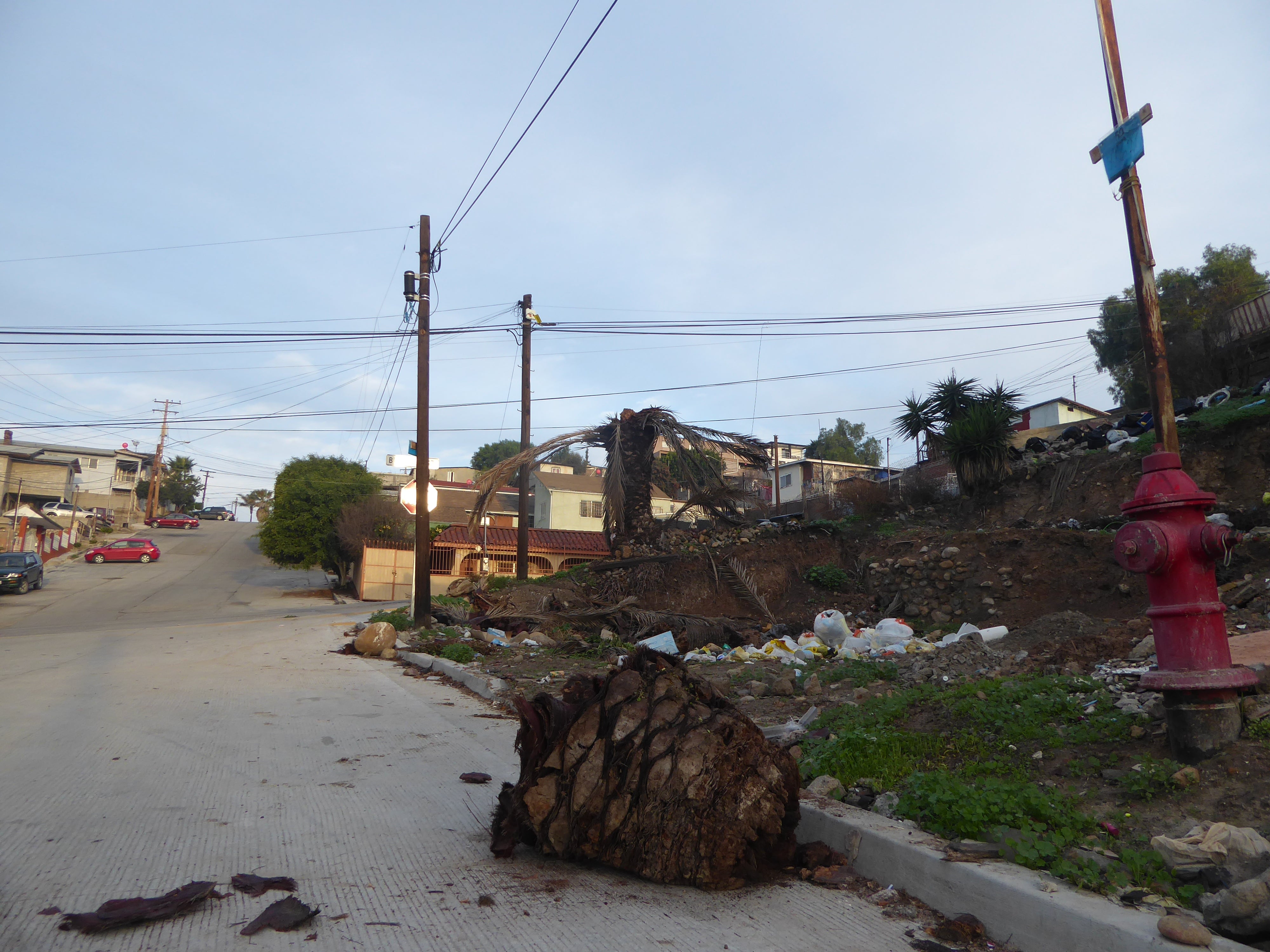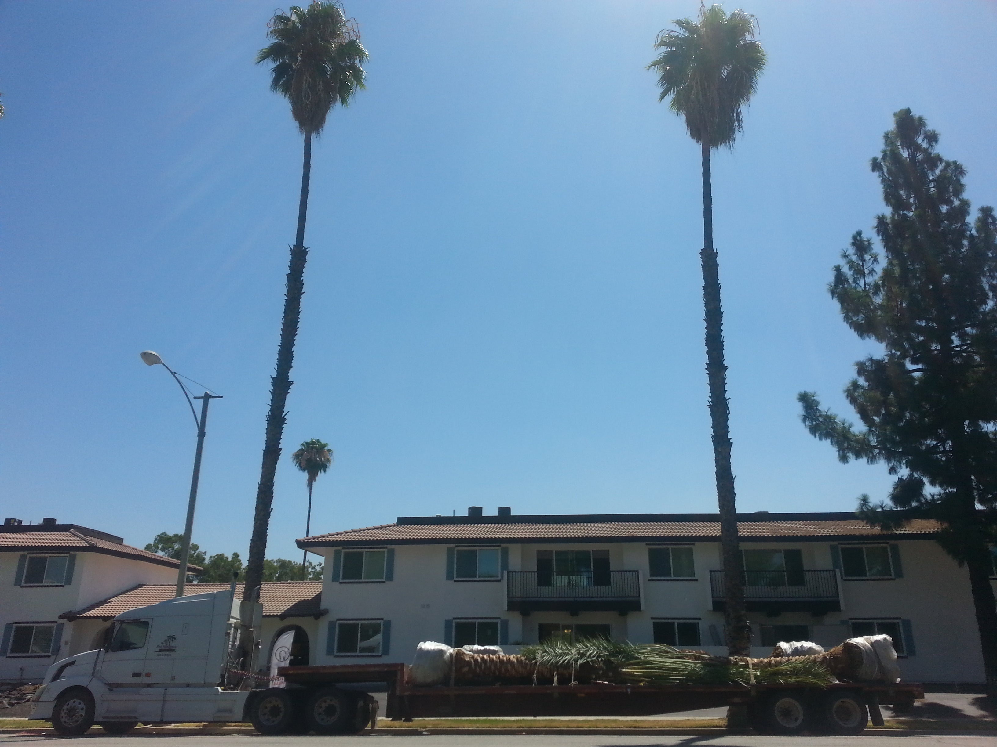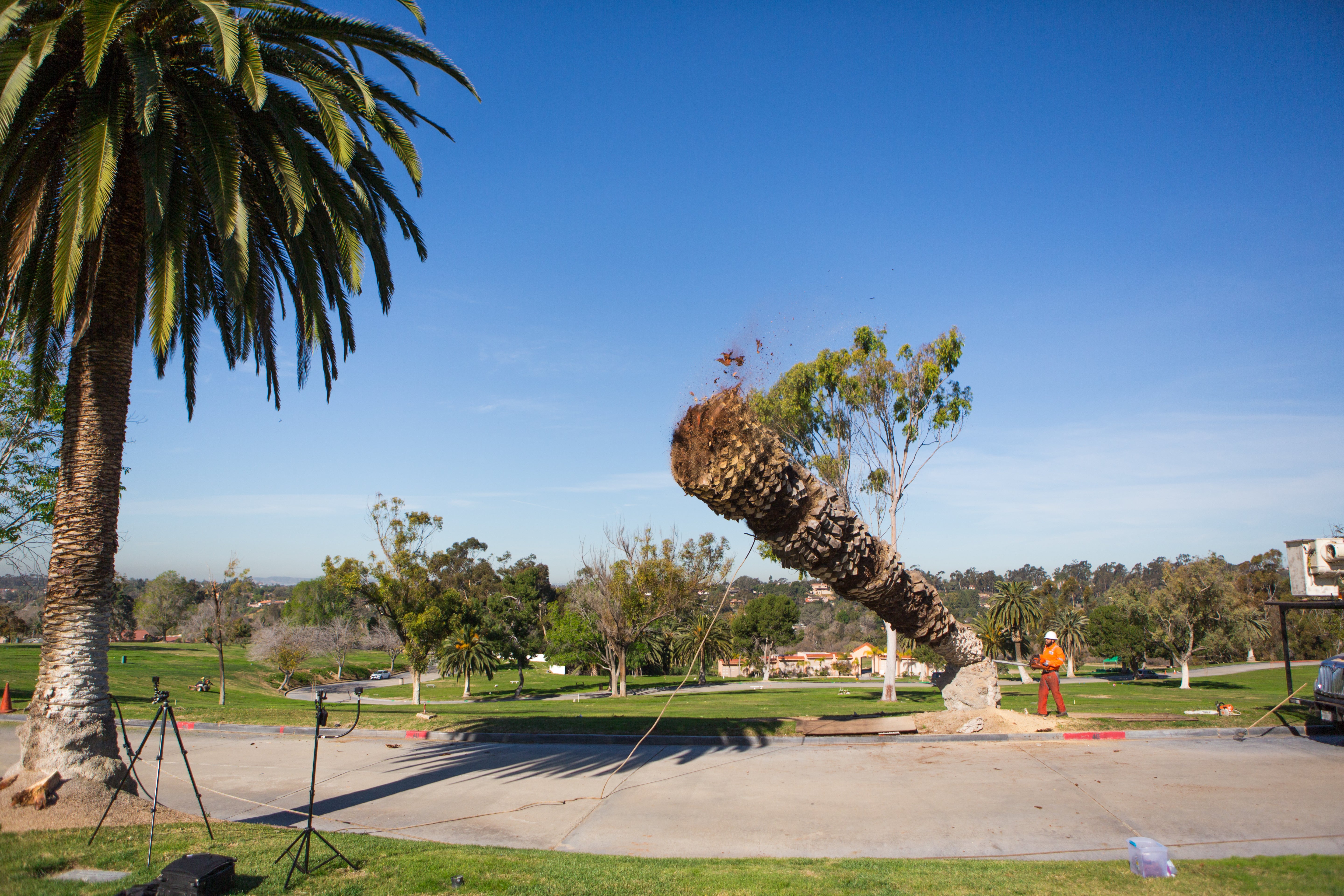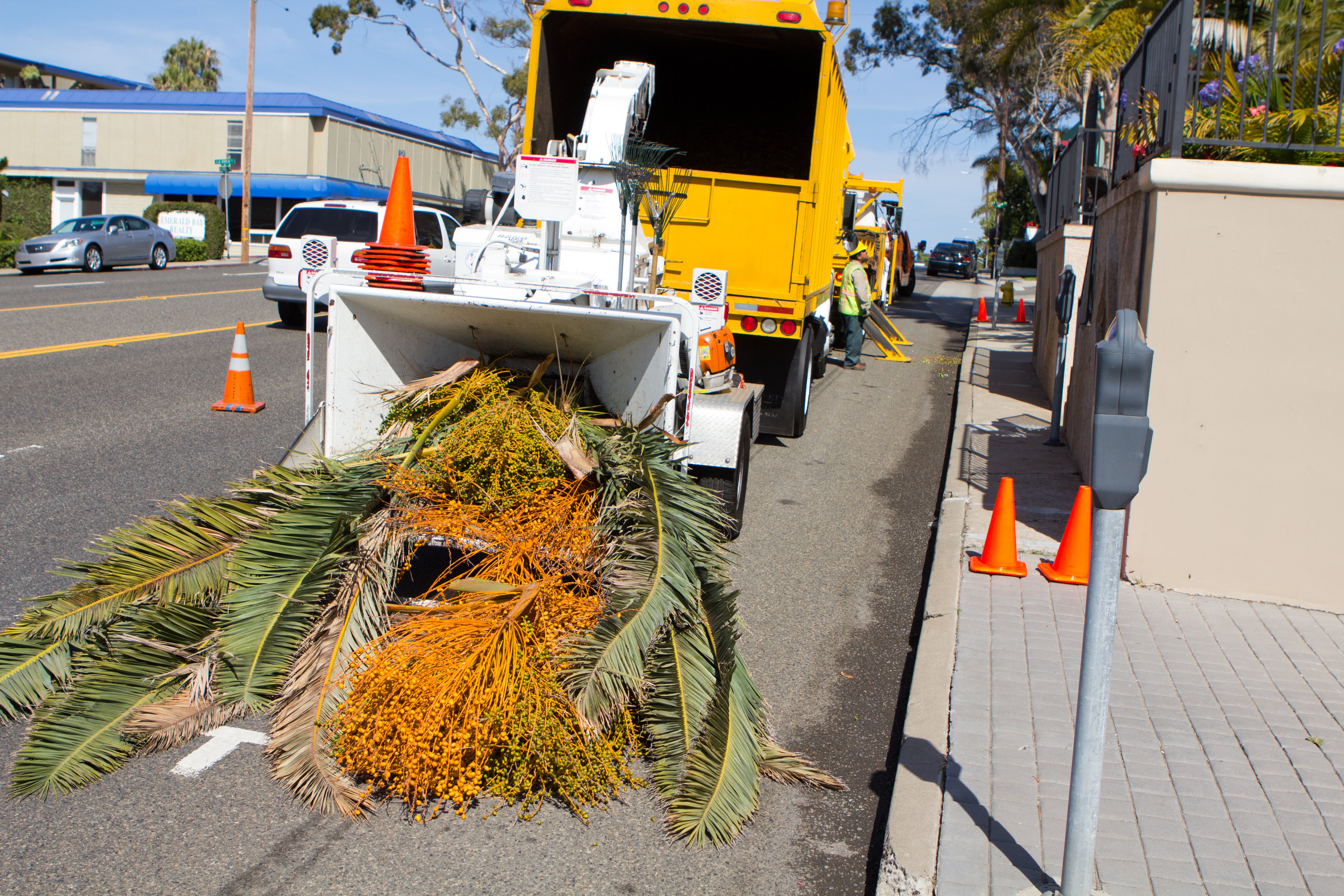 | (A) A dropped Canary Islands date palm crown that rolled down the street after being killed by SAPW. (B) Dropped Canary Islands date palm crown in a reserve in San Diego County | |