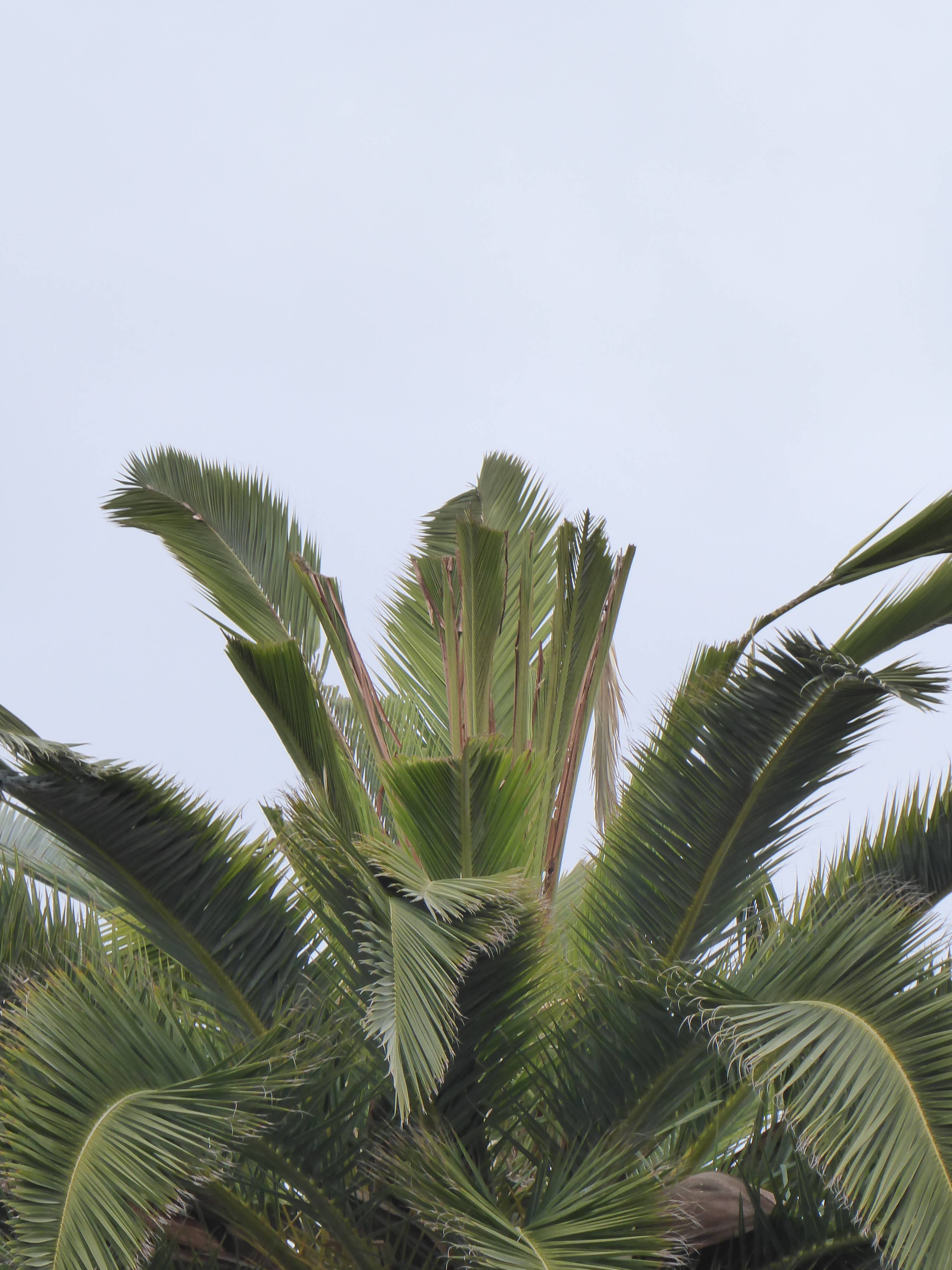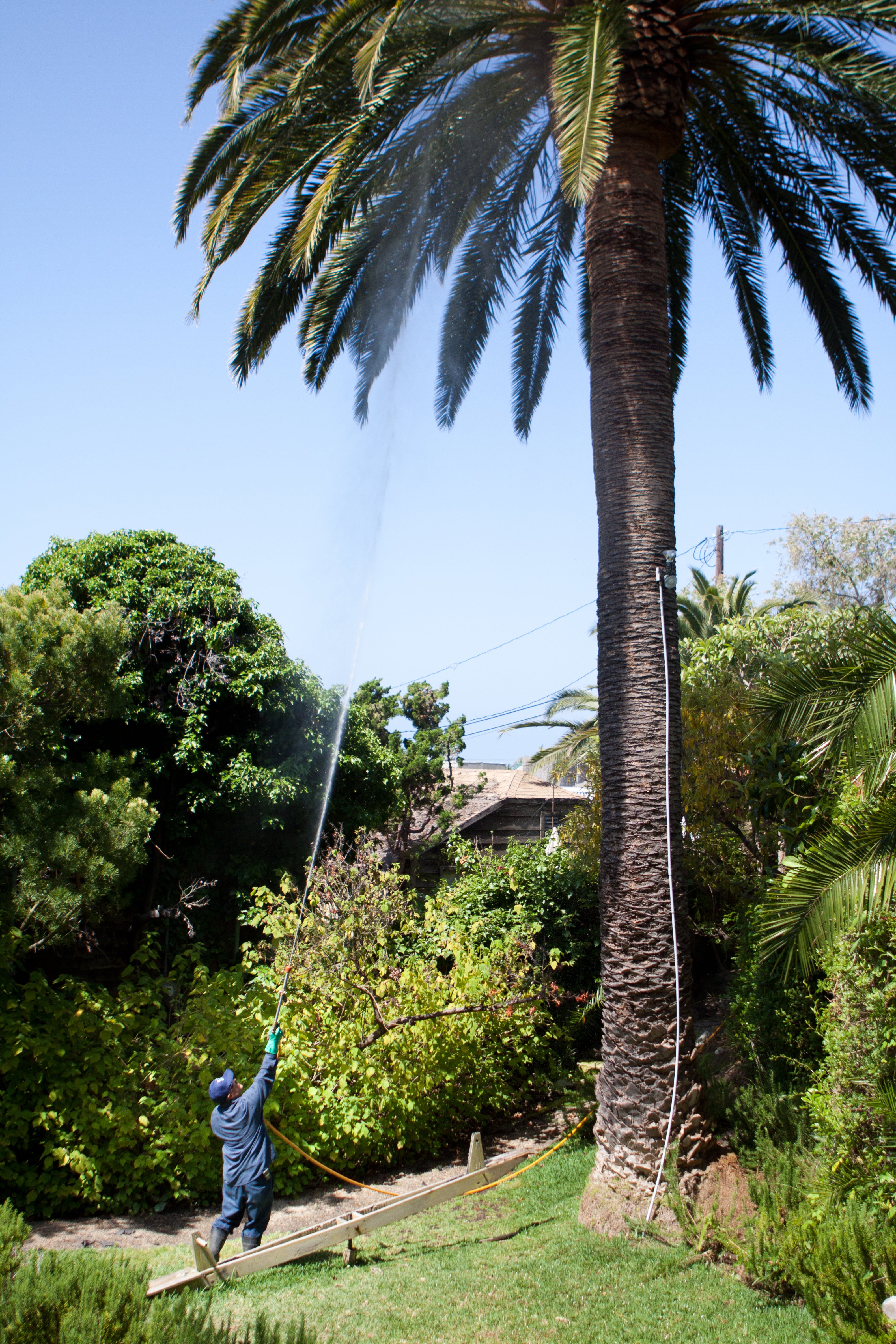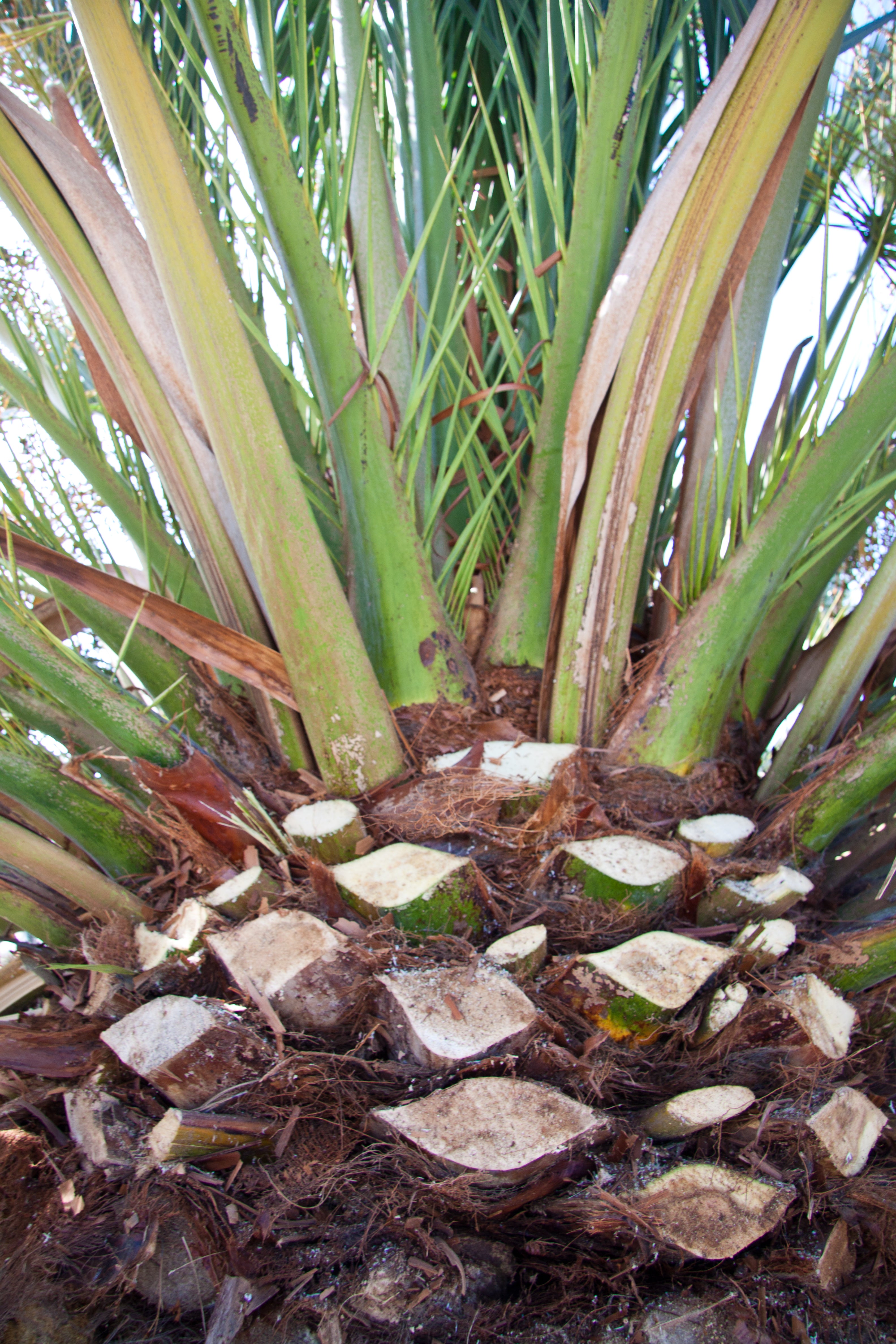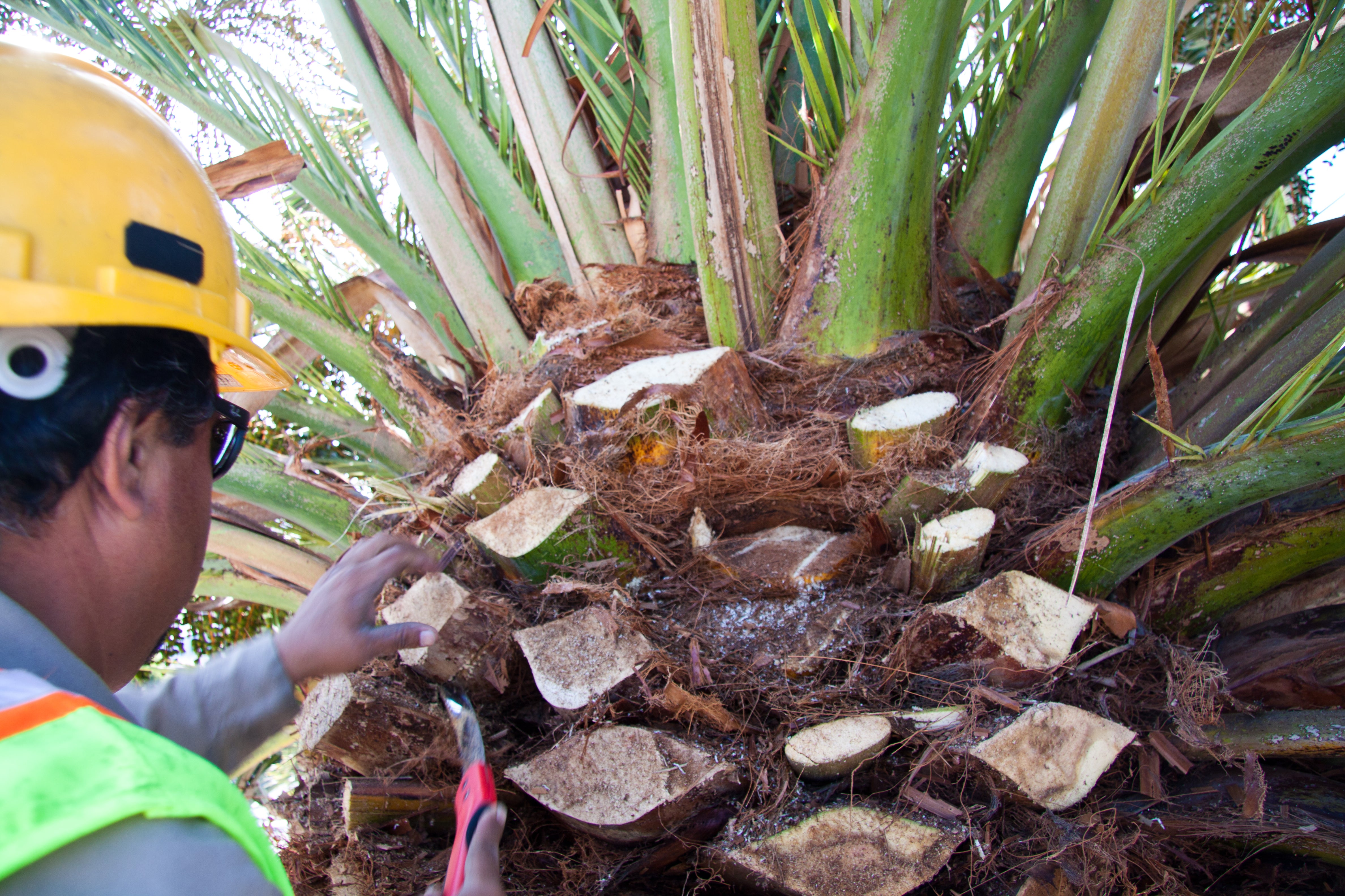 Efficacy of pesticide treatments on weevil activity in the crown can be checked via a “window.” A window is created by removing palm fronds in the crown which then permits access to the crown so visual inspections for weevil activity can be conducted.