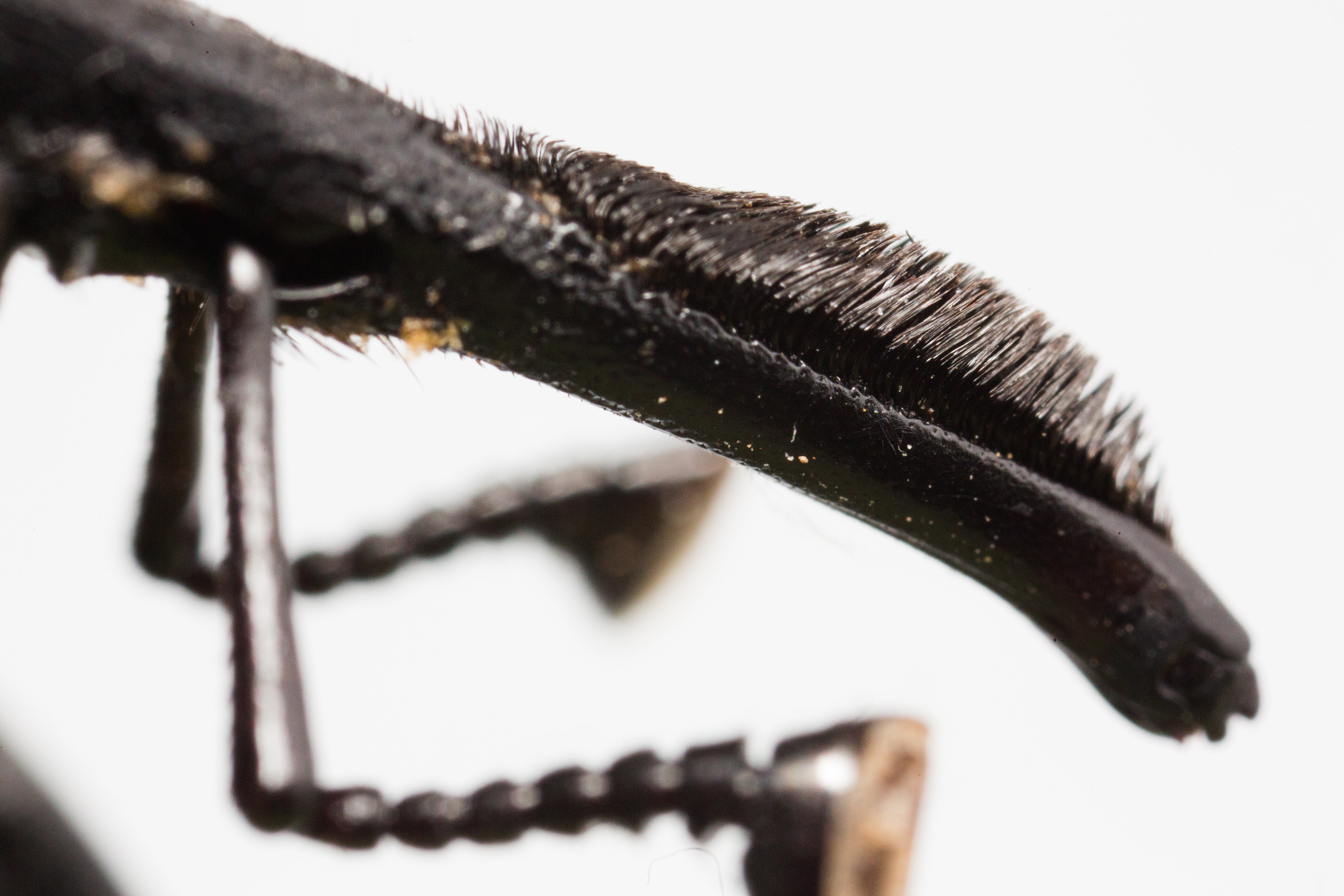 (A) The top of a male SAPW rostrum showing the dense comb of setae that characterizes this sex. (B) The top side of the female rostrum lacks setae which makes distinguishing between sexes easy to do |