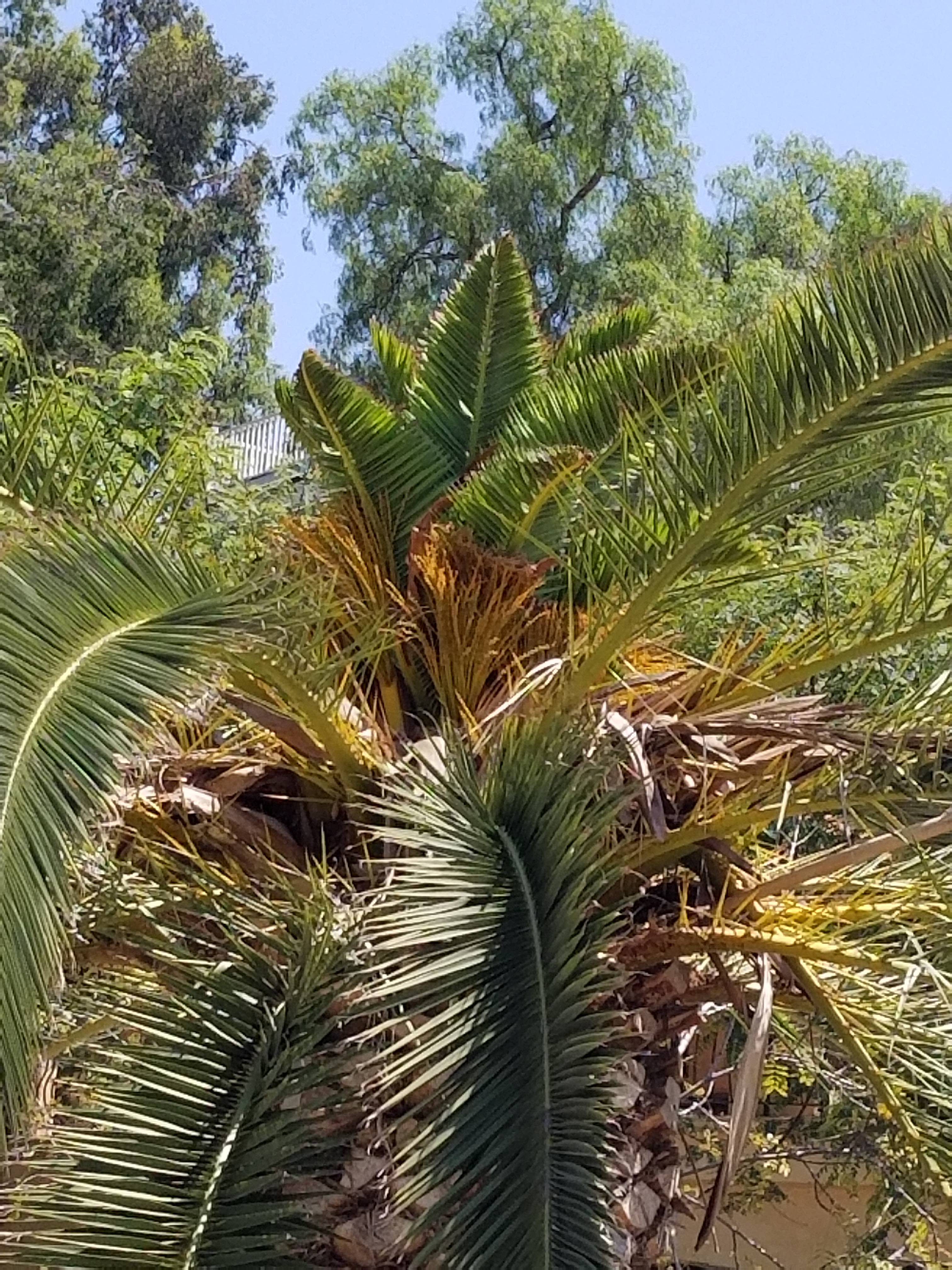 Canary Islands date palms showing various levels of feeding damage caused by SAPW |