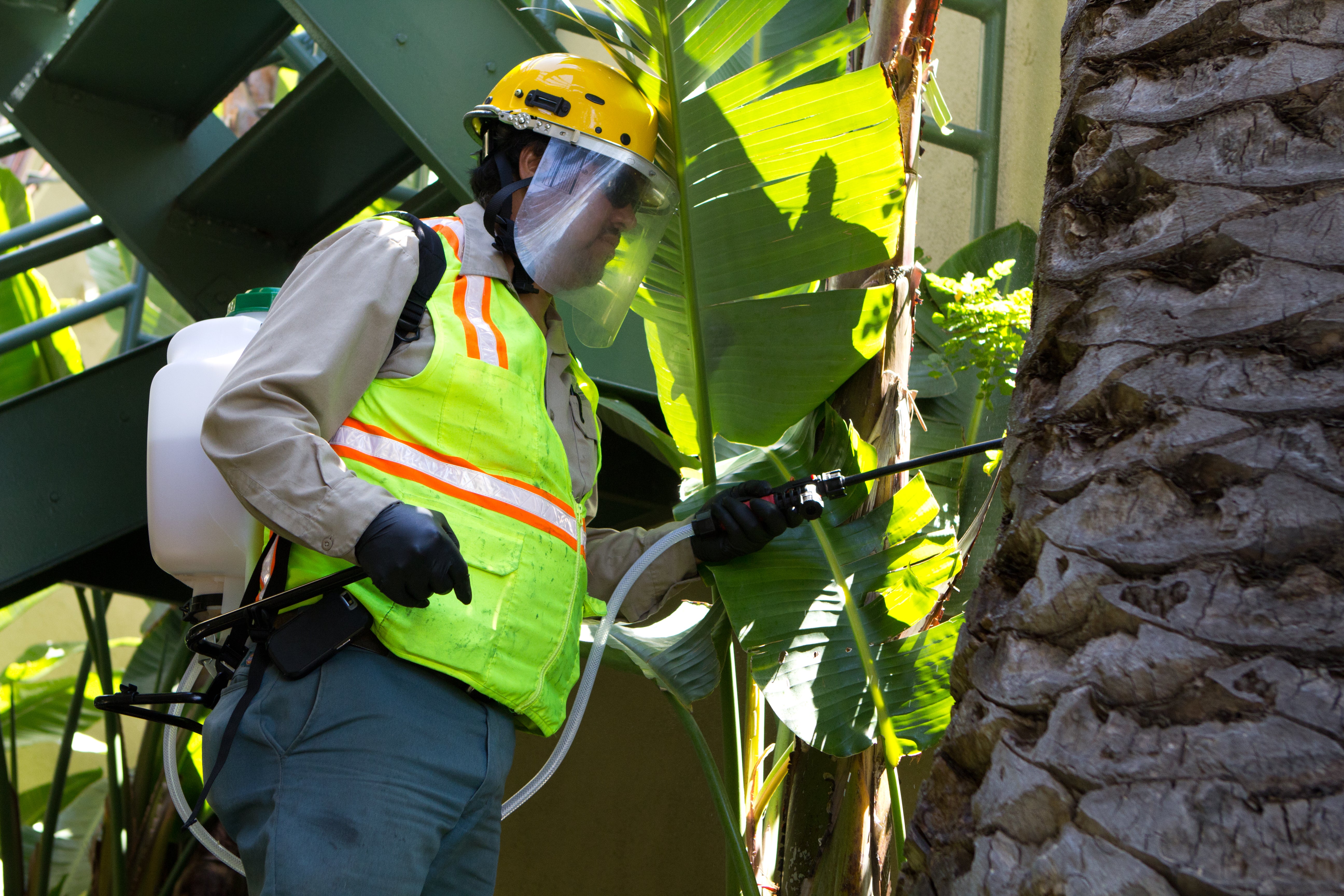Systemic pesticides are at present the most effective tool available for protecting and potentially curing palms of SAPW infestations. Systemic pesticides (mainly neonicotinoids) are translocated within the palm and accumulate in the meristematic tissue where weevil larvae feed. Systemic pesticides can be applied as soil drenches, soil injections, trunk sprays or paints, trunk injections, or as drenches applied to the crown. Contact insecticides (i.e., pesticides that either kill on contact or leave a dry external residue that is lethal upon contact) can be applied to palm fronds or pruning wounds to kill adult weevils attracted to these substrates. Developing a pesticide treatment program should be made in consultation with a professional arborist, and two or more applications per year may be needed in infested areas to protect palms from weevil attack. Systemic pesticides applied as crown drenches can “cure” heavily infested palms allowing meristematic tissue to recover and new frond production results.