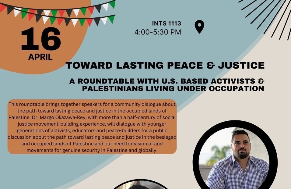 This roundtable brings together speakers for a community dialogue about the path toward lasting peace and justice in the occupied lands of Palestine. Dr. Margo Okazawa-Rey, with more than a half-century of social justice movement-building experience, will dialogue with younger generations of activists, educators and peace-builders for a public discussion about the path toward lasting peace and justice in the besieged and occupied lands of Palestine and our need for vision of and movements for genuine security in Palestine and globally.