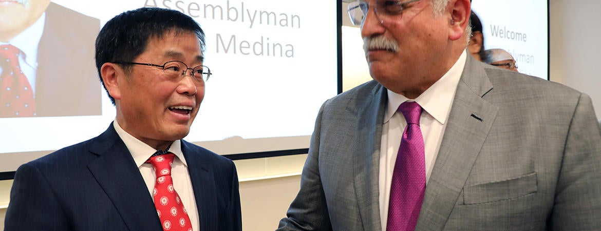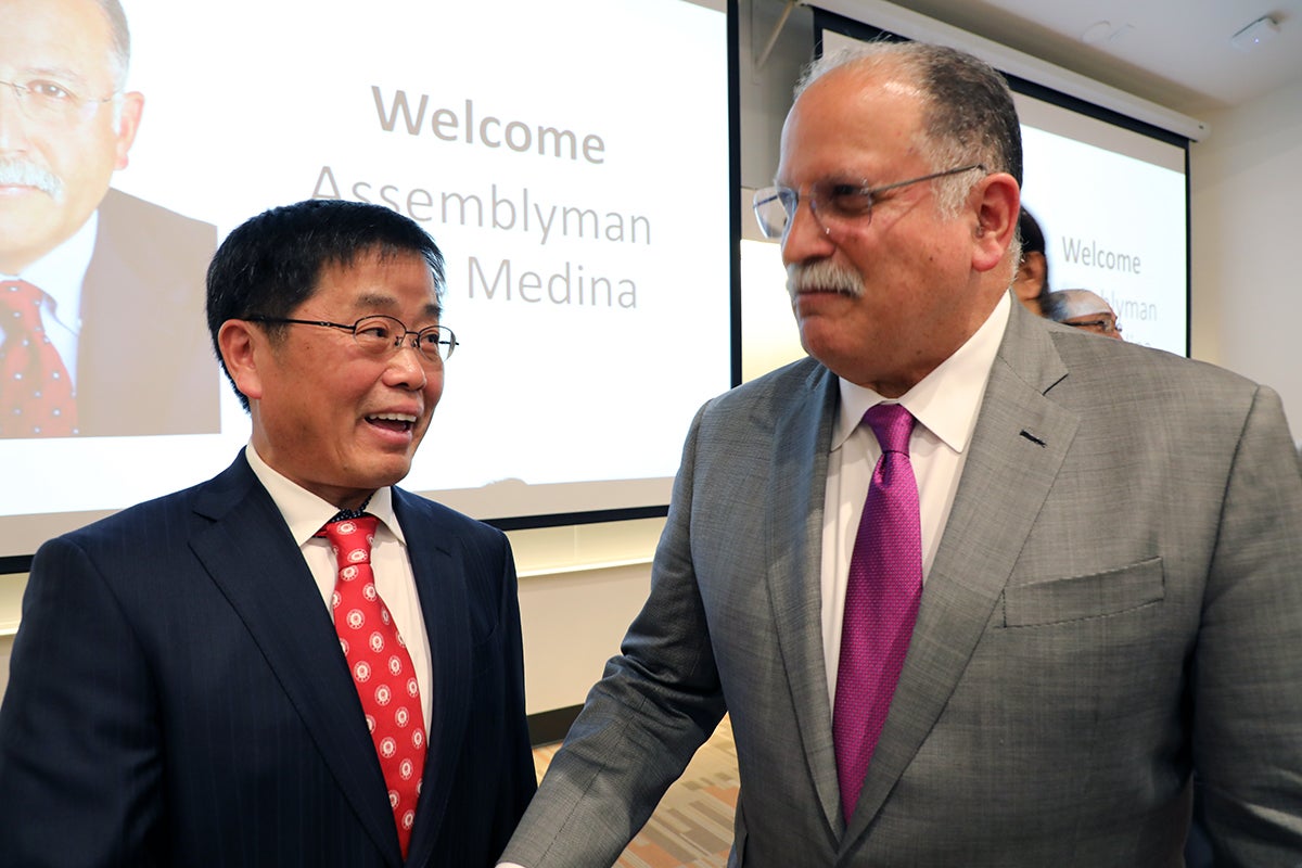 Assemblymember Jose Medina ’74, MA ’84 was presented with the UCR School of Business “2017 Outstanding Alumnus of the Year Award,” by Yunzeng Wang, Dean of the UCR School of Business.