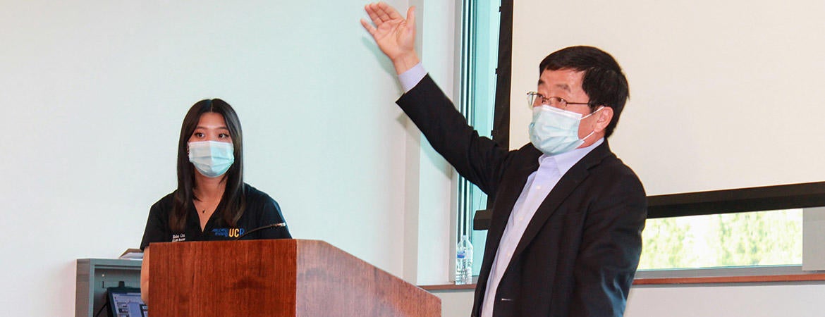 Banner image: ASUCR senator Helen Chu '23 (right) and UCR Business dean Yunzeng Wang (left)