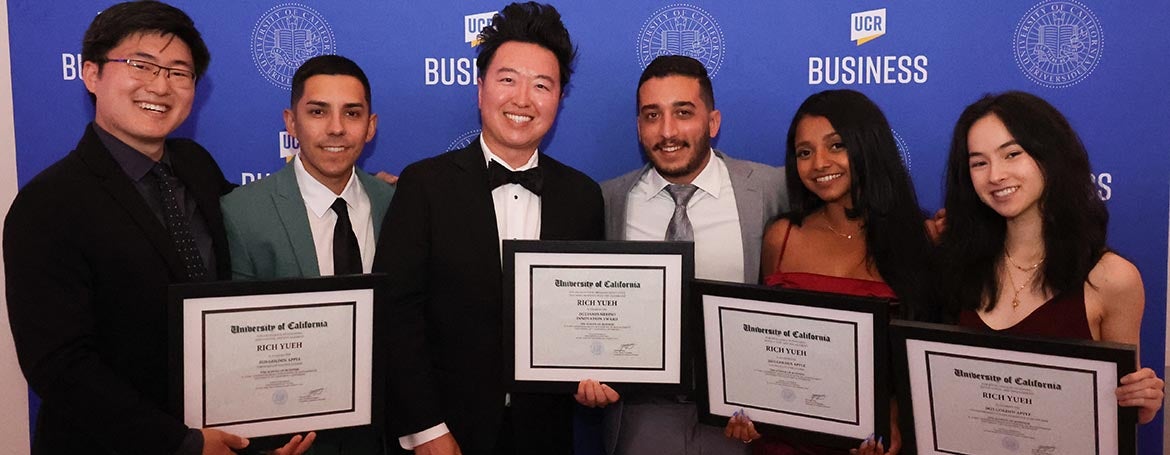 Last year, Yueh also received the School of Business’s student-voted 2020-2021 Golden Apple Award in the categories of preparation for business administration major and upper division major requirements. In 2019-2020, the students selected him for the same award in the category of graduate elective courses, and he was presented with the Outstanding Disability Ally award by the UCR Student Disability Resource Center.