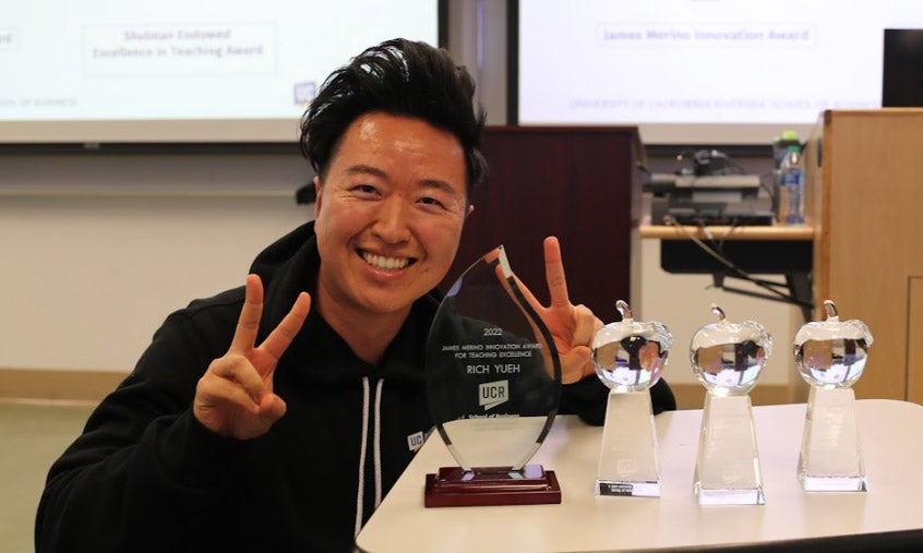 Assistant Professor of Teaching in Information Systems Rich Yueh is “literally the GOAT,” said one of his students referring to the popular acronym for “greatest of all time.” This compliment is representative of the many enthusiastic reviews of Yueh’s teaching style, and students recently voted to acknowledge him with the UCR School of Business’s 2021-2022 James Merino Innovation Award.