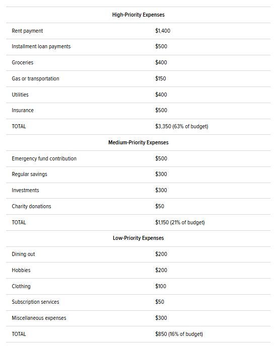 Below is an example budget for a typical American household, broken down into some common expense categories the household might have. This example is based on the real median household income, which is around $64,200 per year or $5,350 per month, after taxes. Keep in mind that actual incomes and expenses will differ widely by person and location.